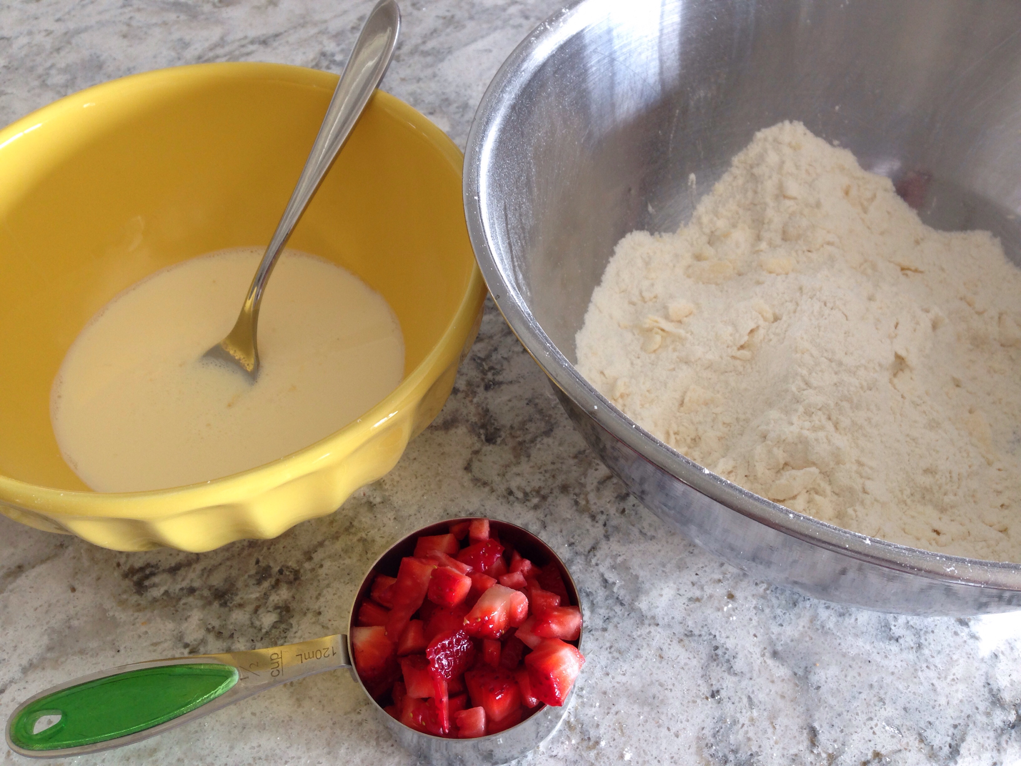 Gently and briefly, knead the strawberries into the dough, but don’t worry if it looks like you are squishing the strawberries slightly.