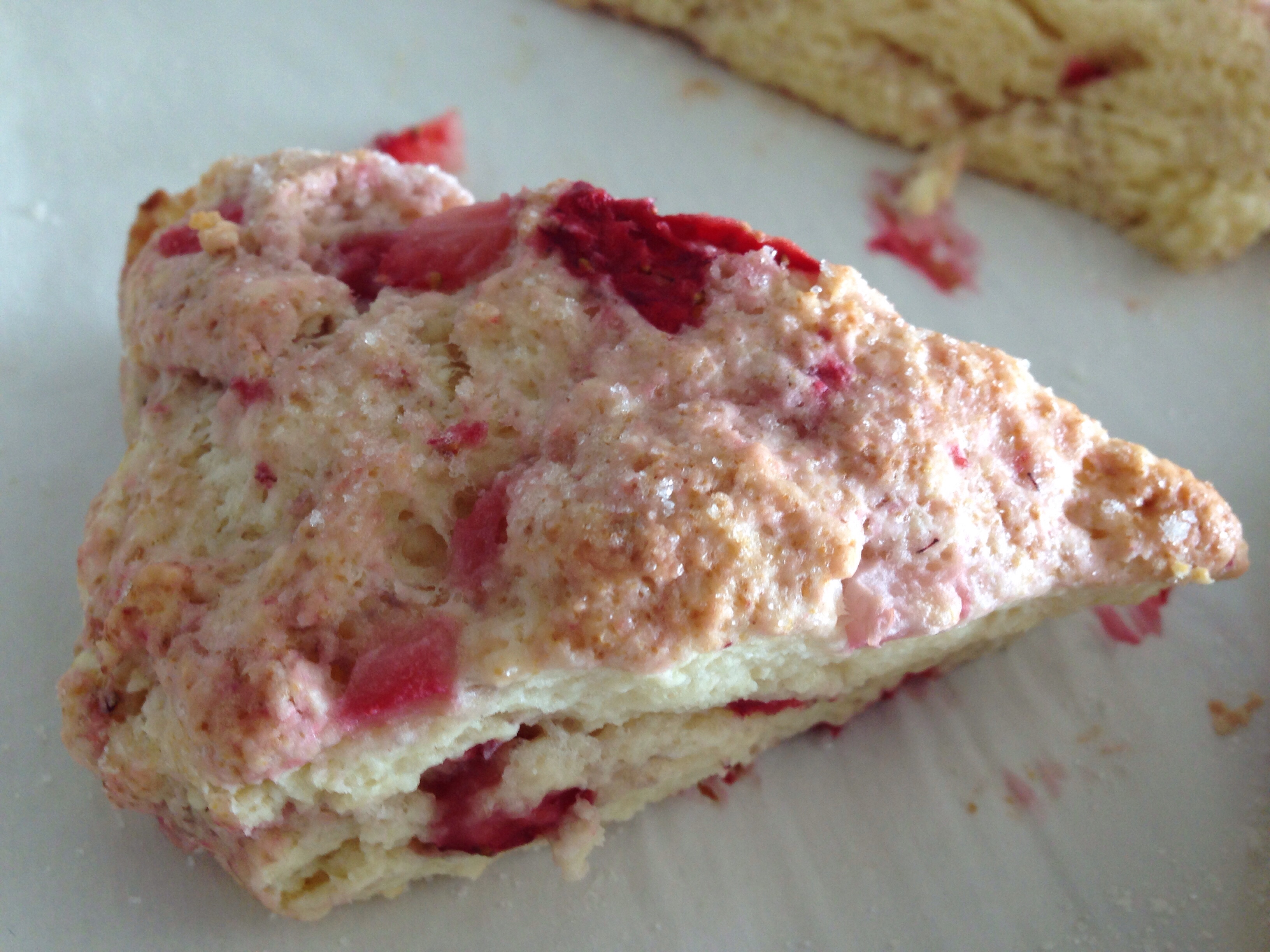 Place a sheet of parchment onto a baking sheet. Pat the dough out until you have a circle 6-7 inches in diameter. Cut into 8 pieces and move them slightly apart from each other. Sprinkle the tops with a pinch of sugar each. Bake for 15-20 minutes. I find with the fresh strawberries, I need to cook them for the longer time due to the extra moisture.