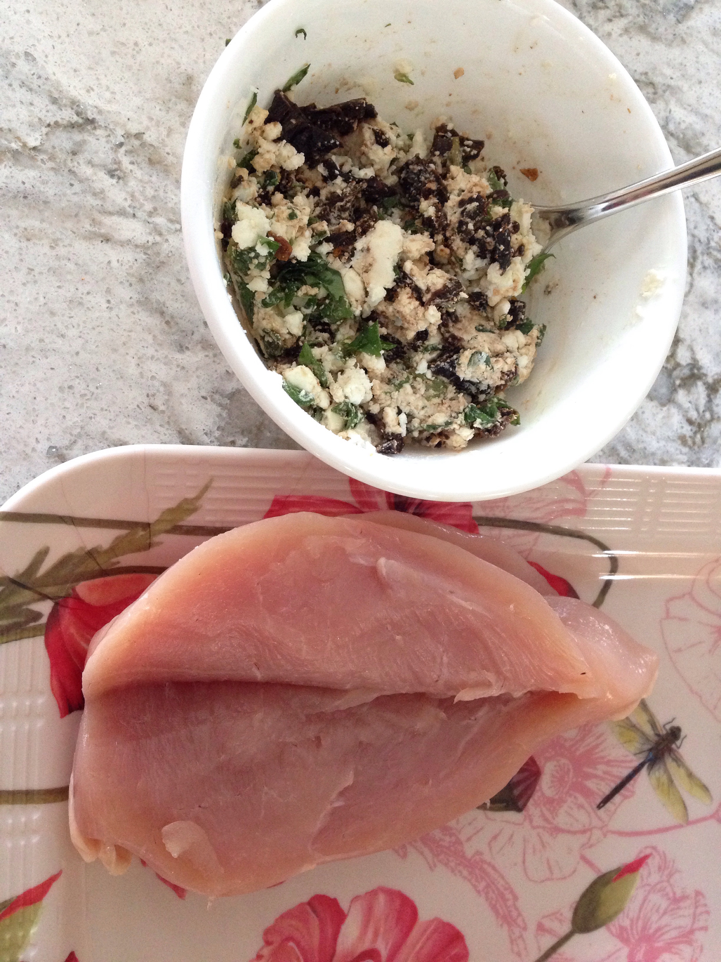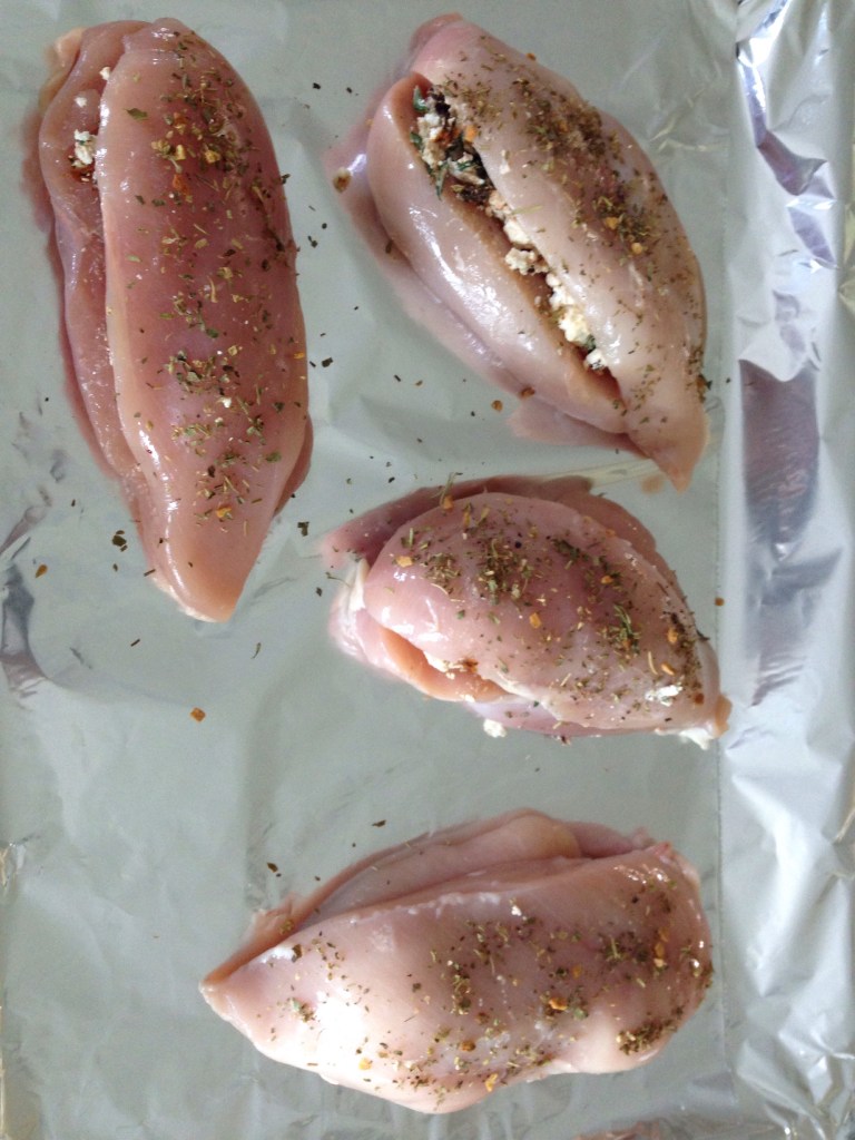 Cut a pocket into each chicken breast and stuff with 1/4 of the mixture. Sprinkle with Italian seasoning.