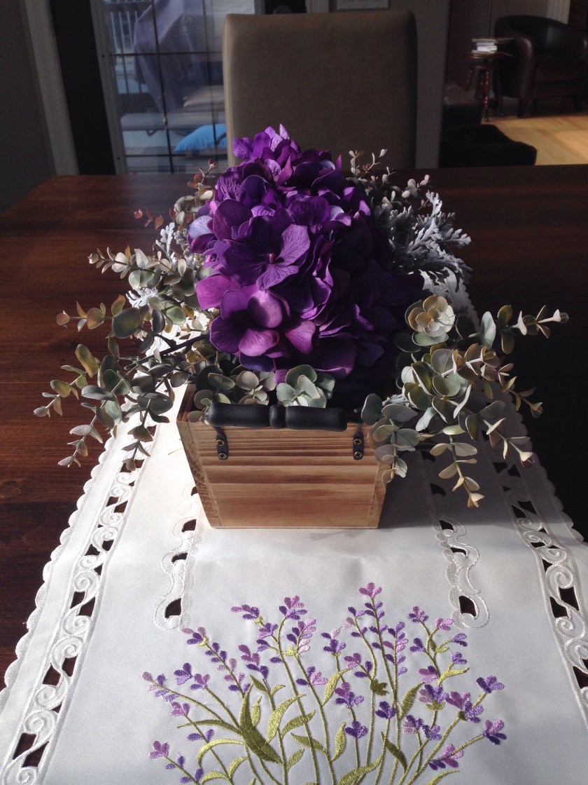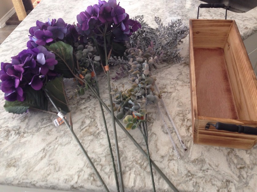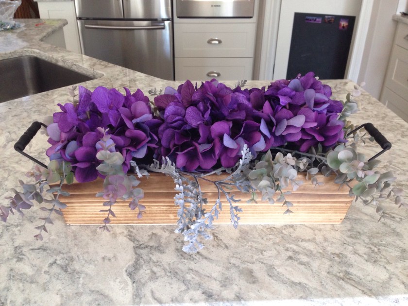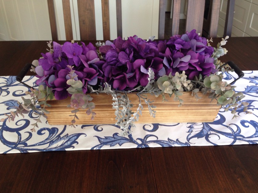 I started with a wooden box that can be filled with apples, lemons, pumpkins, Christmas balls, etc. according to the season, and bought a few silk flowers at Michael’s to make something that doesn’t need tending. I wanted purples to pick up the purples I have going on in the living room this summer. I’m pretty pleased with the result.