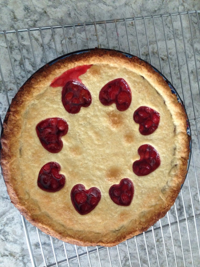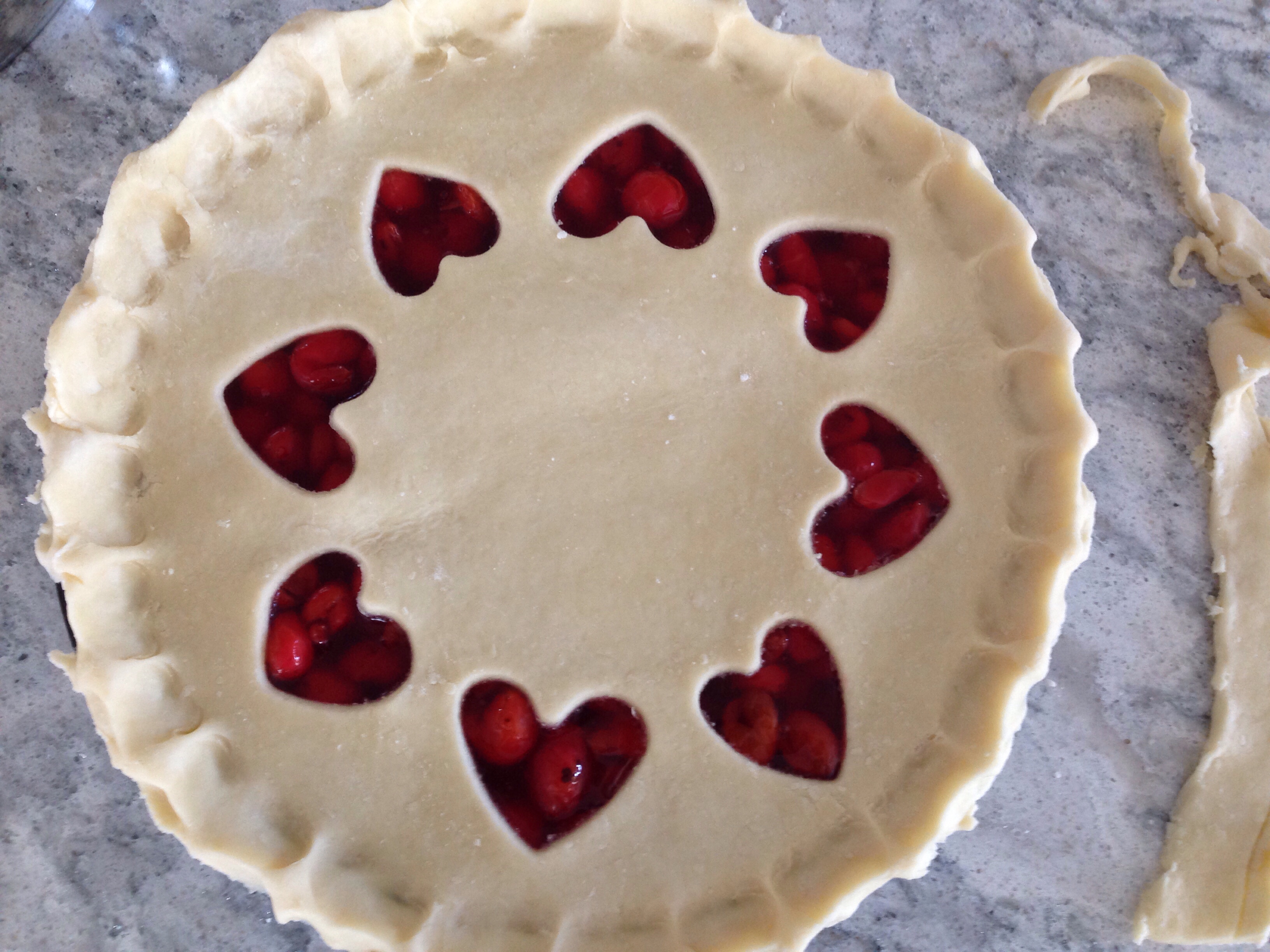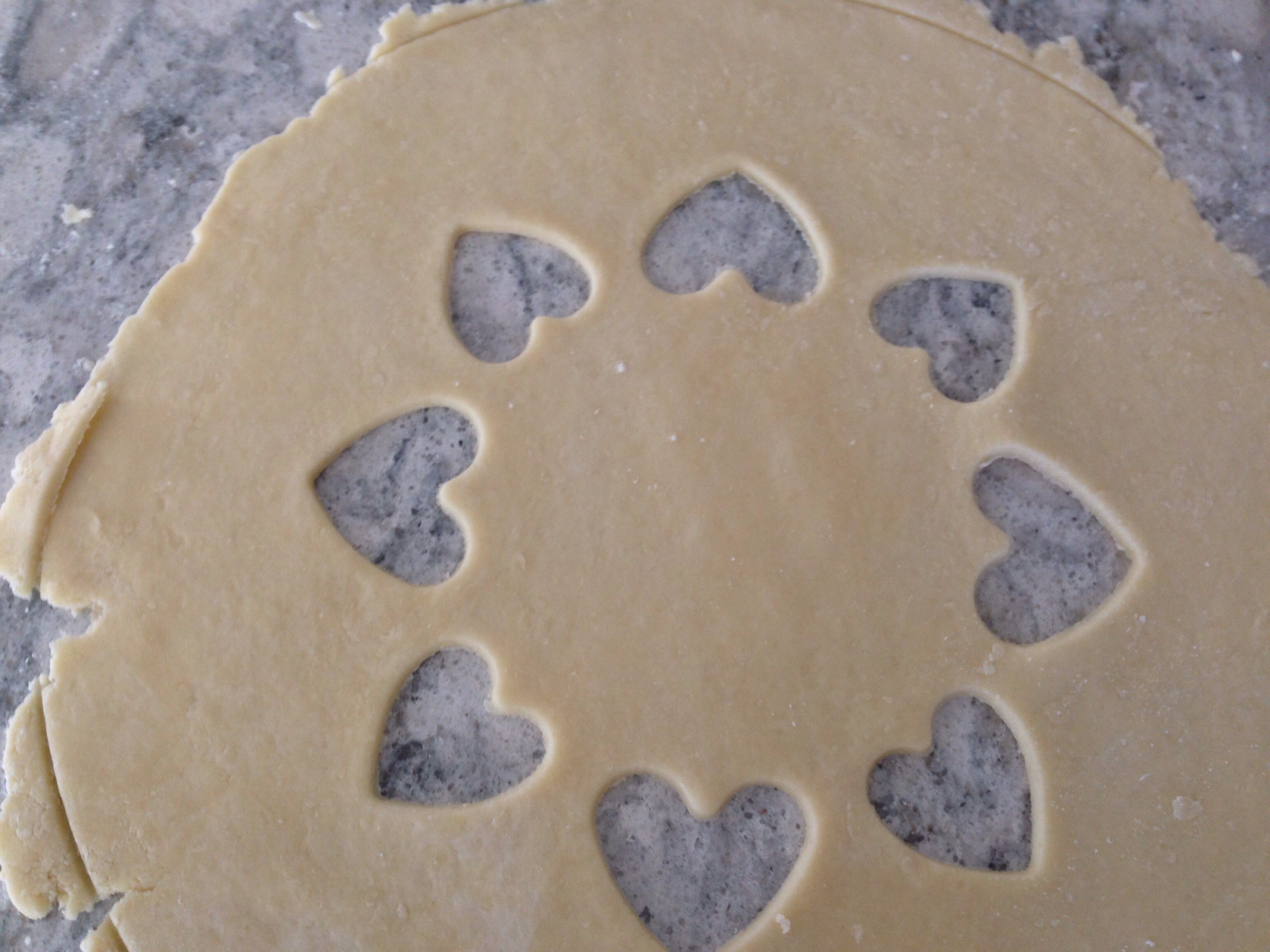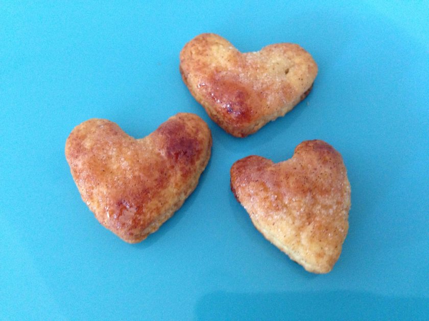 I sprinkled cinnamon sugar on the hearts and pastry scraps remaining and baked them during the 450 degree portion of the baking. Some added cheer!