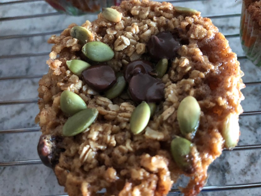 Mix the wet ingredients together. Stir in the rest of the ingredients and let it sit for 20 minutes before baking. There is no flour in this recipe, and this rest period allows the oats to hydrate. Preheat the oven to 350 degrees F. Scoop the mixture into muffin cup liners. Top each one with a few chocolate chip and pumpkin seeds. Don’t go crazy adding things to the top as it will make it difficult for the muffin to rise. Bake for 30 minutes.