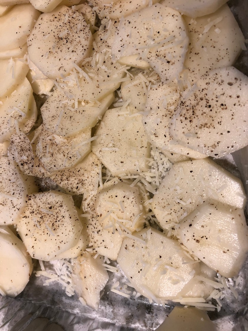 Thinly slice enough potatoes to mostly fill a 9×13 pan, leaving spaces for liquid. Sprinkle salt, pepper and Parmesan cheese between the layers. You can add some cheddar too if you like. Maybe a cup of cheese in total.