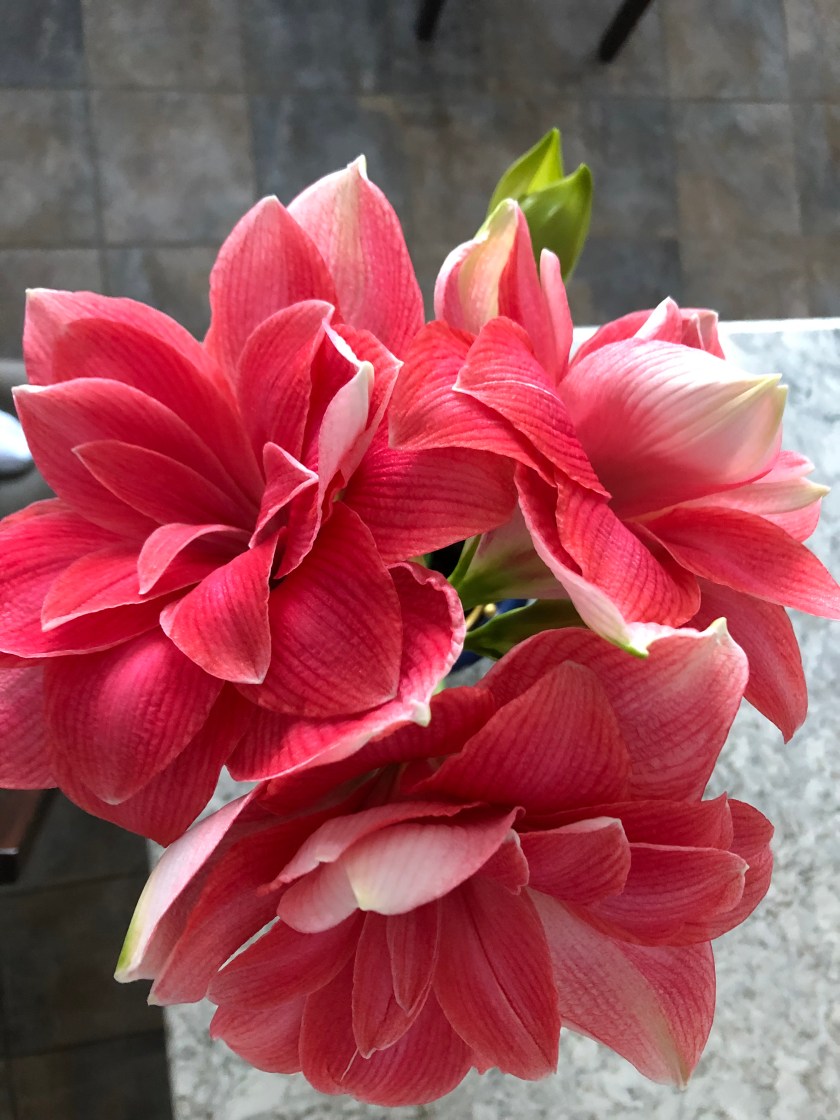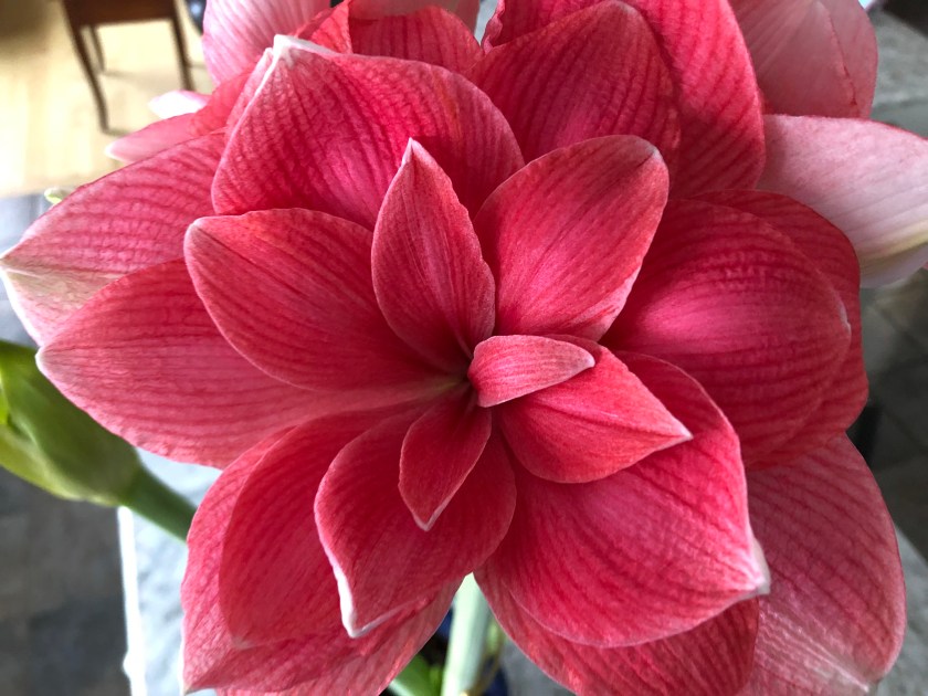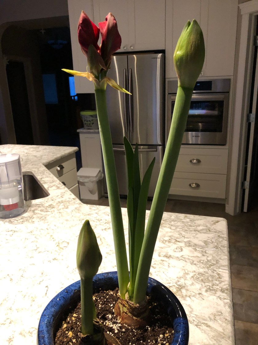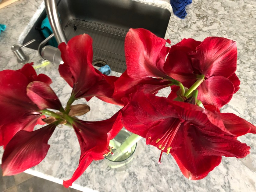 Those blooms lasted until my pink amaryllis started blooming. The pink one is still going strong and will hopefully last until the tulips I have been forcing in the garage begin to bloom.