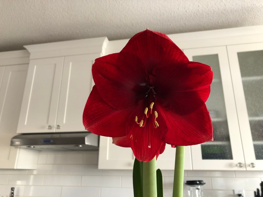 I have had great luck with my amaryllis plants this year. The red one below started blooming on Christmas day and made 10 large beautiful blooms! It really outdid itself – so much so, I ended up cutting the flowers to put in water as my staking was insufficient.