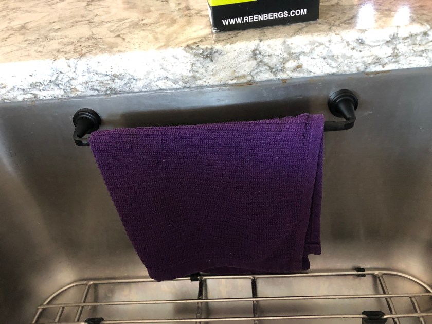This is a cool find that makes me very cheerful indeed! I like my large single sink, but it left me with no obvious place to hang the dishcloth between loads because it had no divider like I was used to using in my old double sink. I don’t like keeping my dishcloth over the faucet or on the racks under the sink where I dry my towels. This problem plagued me and I tried several other “cloth draping” solutions. Finally, I found this Danish design cloth holder by Reenbergs that uses strong magnets to hold the rail in the sink! One on each end of the rail, and two more on the reverse side of the sink. I have knocked it sideways a couple of times, but now that I’m used to how much force it will withstand, it is working magnificently. Woooohoooo!