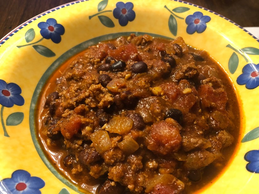 As I mentioned in an earlier post, my husband’s New Year’s resolution was to learn to cook more things. This is a chili he came up with after looking at a few recipes and seeing what we actually had in the pantry. I think it is a keeper!