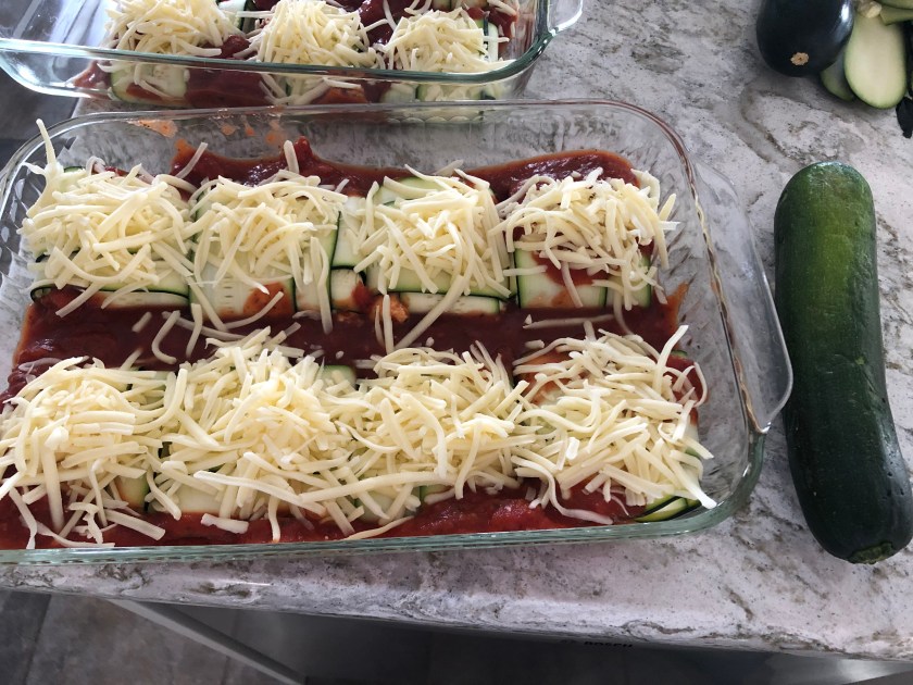 Add a big tablespoon of cheese mixture, then fold over the ends of the top zucchini slices. Repeat with the bottom slices. Flip the package over and set into baking pan.