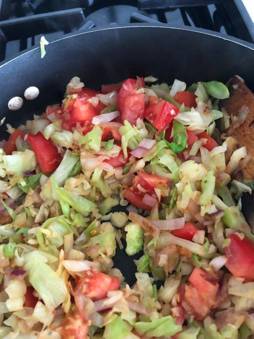 In the summer, I simplify my cooking significantly – eating raw garden and farmer’s market vegetables and fruits, cooking on the grill outside, and using frying pans (no heating up the house with the oven!). This is a simple meal that can be enjoyed for breakfast, lunch or dinner and can be made with things I almost always have around – cabbage, onion, and tomatoes. I add in mushrooms or grated carrots or peppers as the mood strikes. You can make this in one frying pan, but I use two if I cook with mushrooms (to keep them separate for He Who Doesn’t Enjoy Them). Just dish up the veg and then cook the eggs in the empty pan. This serves two of us with some veg left for lunch the next day.
