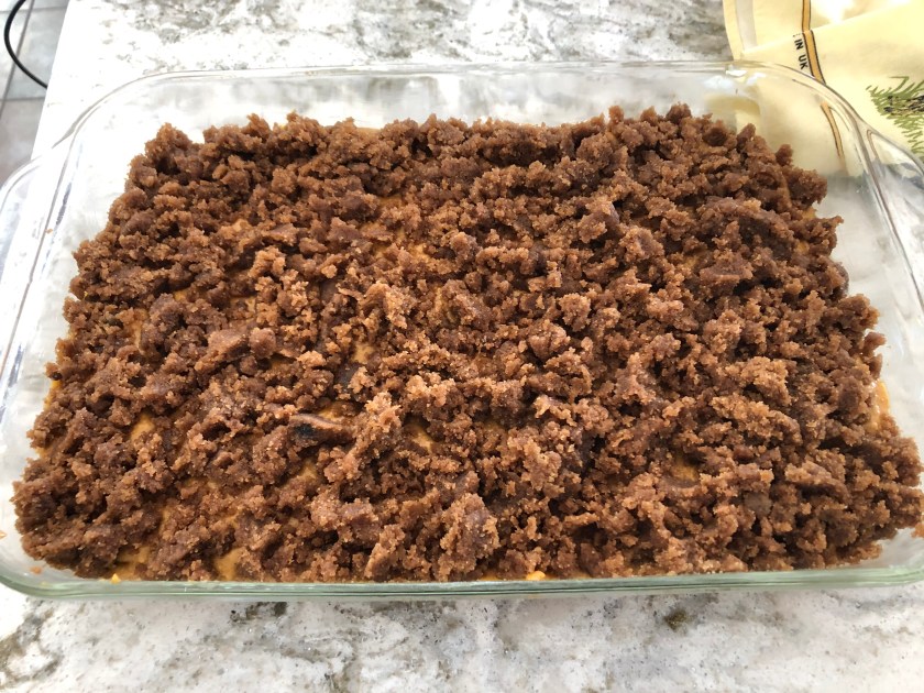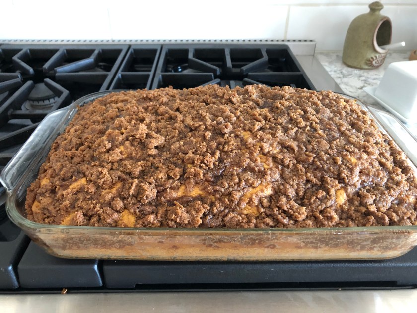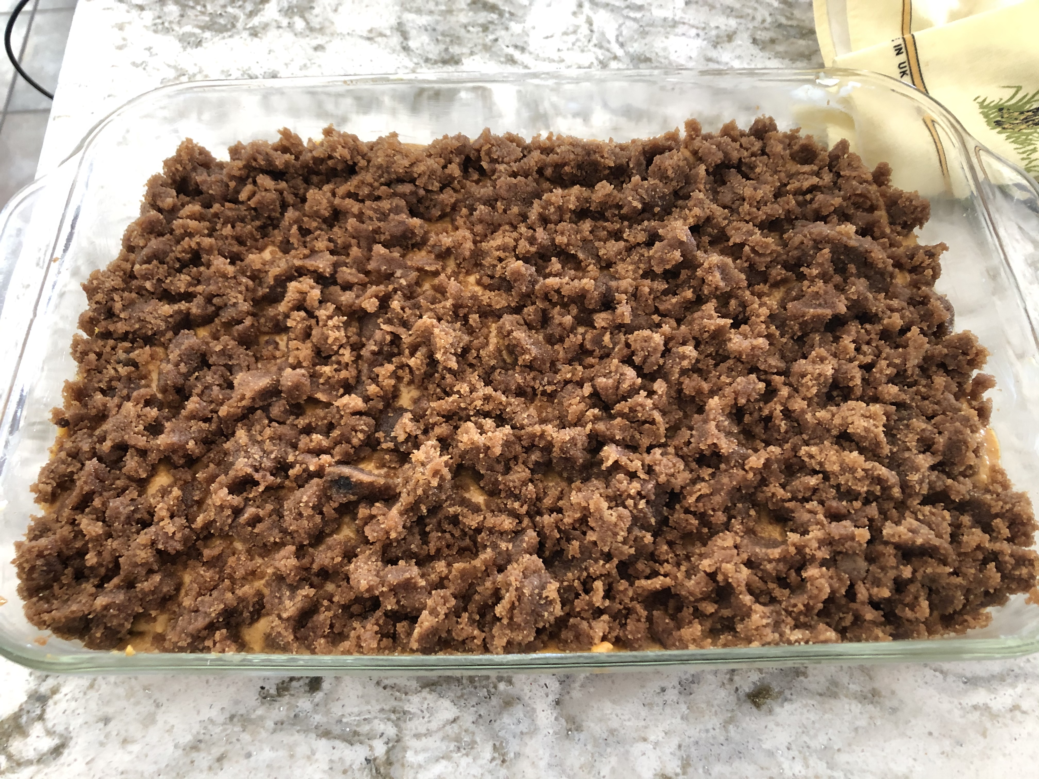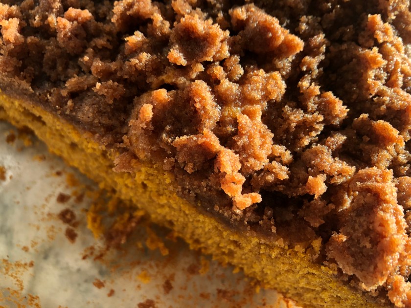 This cake has a lot of pumpkin flavour, and I love anything with a brown sugar crumble on top! Perfect for fall days with a cup of chai or coffee, when seasonal cravings hit! The crumble topping stays crisp for about a day, then softens.