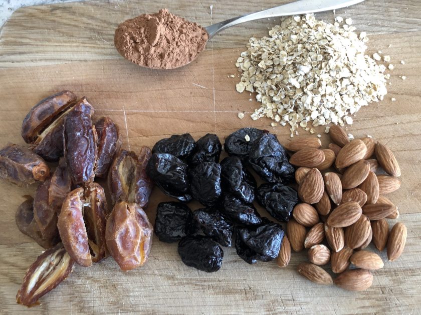 This little snack comes together in minutes and requires neither oven nor stove top. It is made with the same type of ingredients you would use in trail mix, but instead of pouring it all in a bag, it is whizzed up in a food processor until smooth, and then shaped into balls. It gives opportunity to add some extra flavourings to the mix, and elevates dried fruit and nuts out of the backpack and onto the table. I made two types this week, but the combinations are endless!