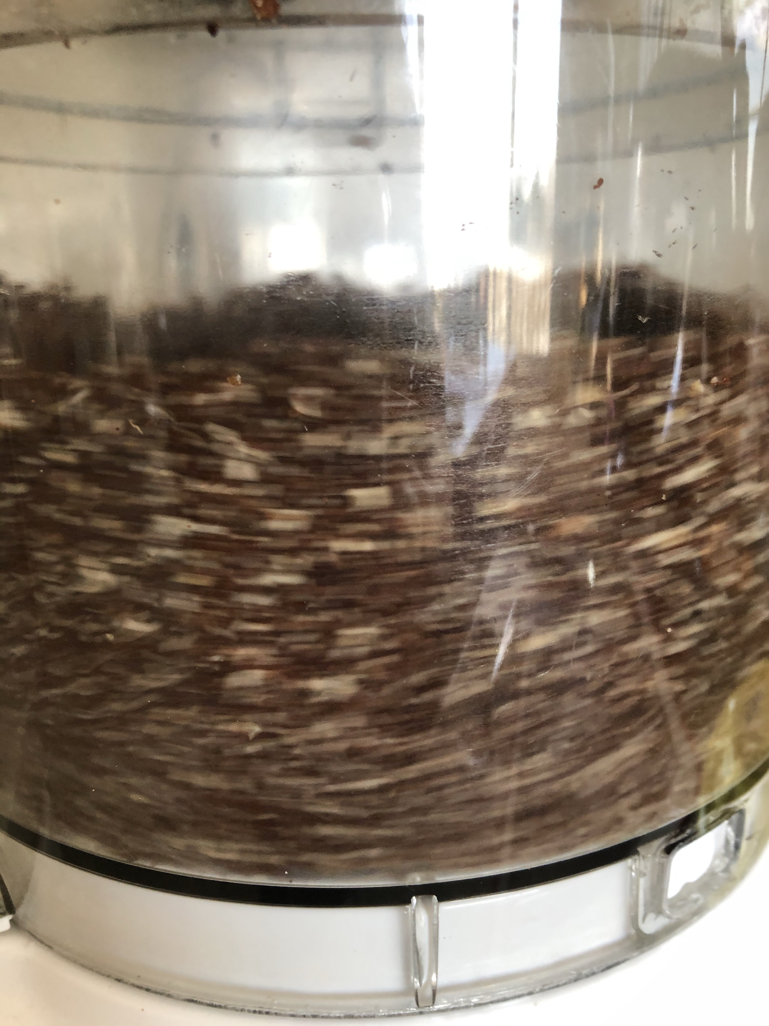 When you are blitzing it, it will look like it will never come together. Then the processor starts flinging bits around, and then it all comes together as a paste. It takes about 5 minutes for the mixture to heat up enough for the nuts to release some oil to help the process along.