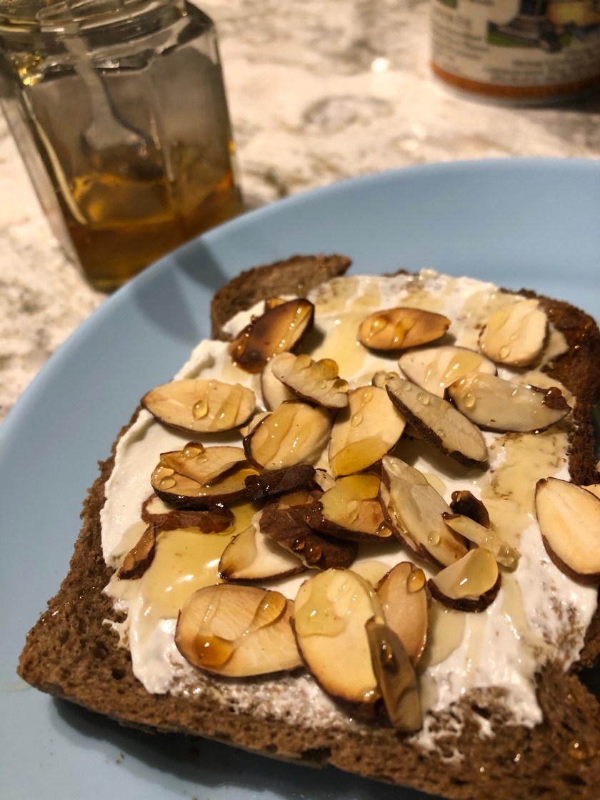 Last time, I strained it to make it thick, spread it on toast and topped with toasted almonds and honey. Not half bad!