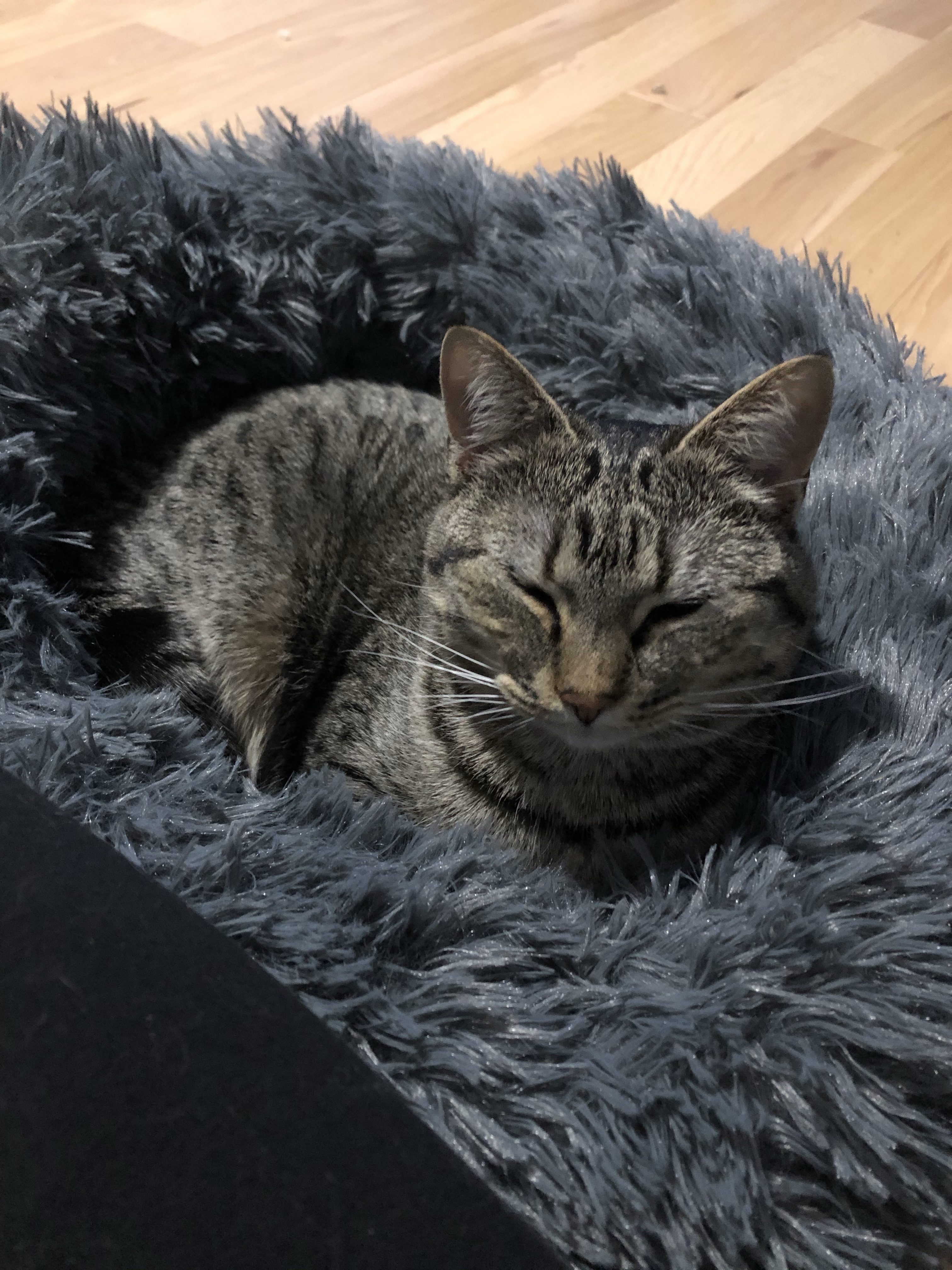 In November, my daughter and I adopted a formerly feral kitten that captured her heart when she worked at an animal shelter. Her name is Lixa, and is 2 years old now. She is a very timid cat, and it took a lot of patience and effort to win her over, but she fits in our household beautifully.