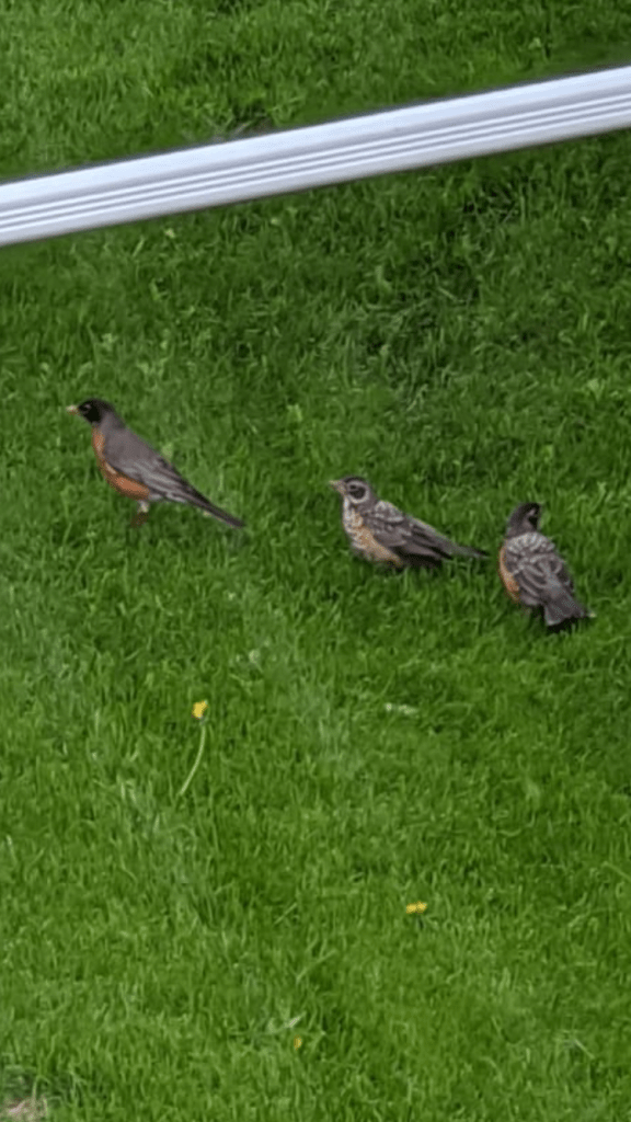 We also have a little family of robins using the undergrowth as a nursery. They are fun to watch. The parents have been liked winged “Skip the Dishes” delivery service all day long for a couple weeks. We saw this week, though, that the fledglings are starting to forage on their own, and not accosting their parents every time they fly into the yard.