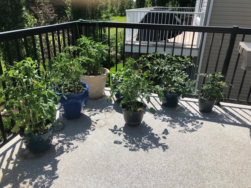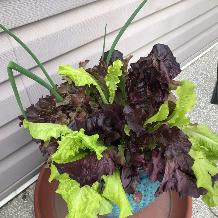 My veggie pots have been doing well this year – my peas are almost blooming as well. My tomatoes look good – I pinched them all back again so hopefully we start to get tomatoes where the blooms are.