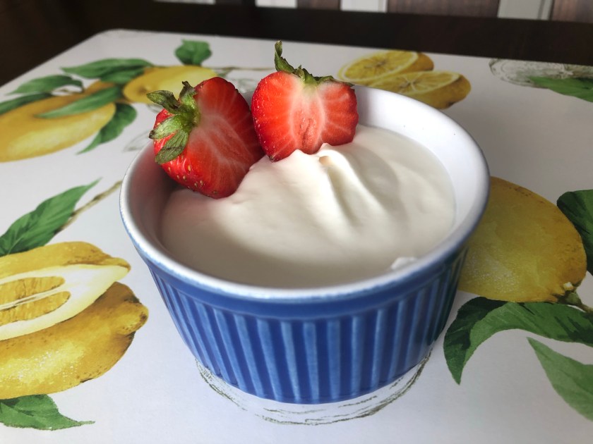 In a large mixing bowl, add the lemon juice, sugar and whipping cream. Don’t worry, the cream does not curdle. Whip until stiff peaks form. Beat in the gelatin mixture until combined. Portion into 5 ramekins and refrigerate for a couple hours so it can set up.