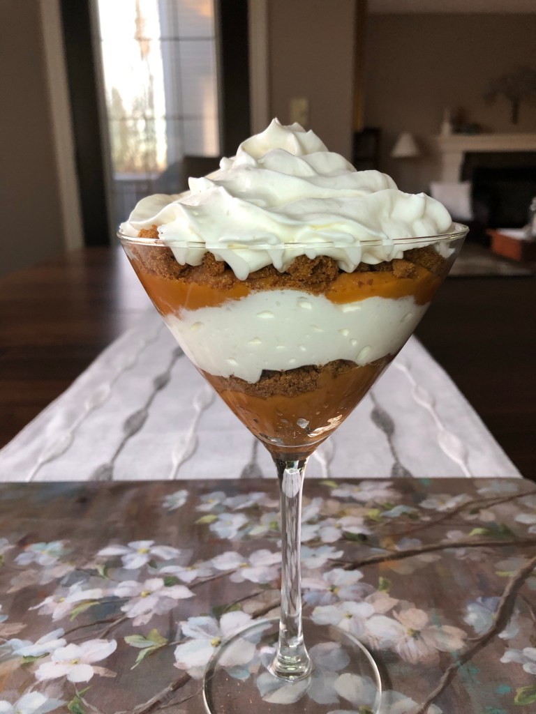 This is too simple to even be called a recipe. It is just using leftovers in a different way. I made too much pumpkin pie filling for our pie, so I baked the rest of the filling separately in a small casserole dish. I spooned it into a parfait glass, alternating with crushed ginger snaps and whipped cream. That’s it. Quick and easy.