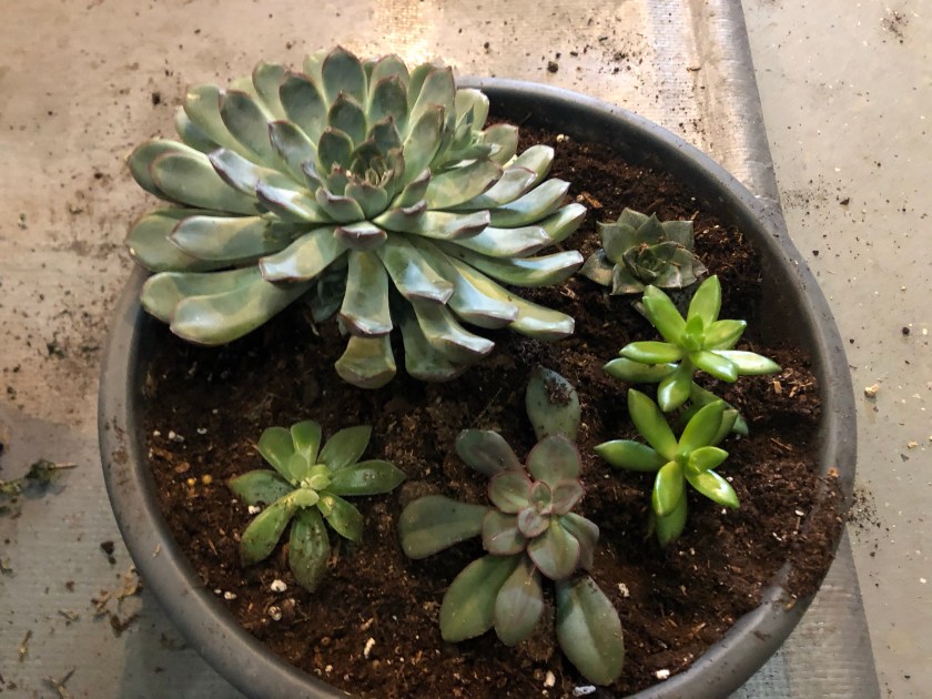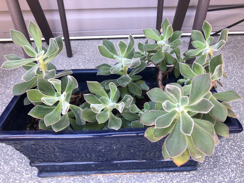In the rectangle pot, I decided to go for all one type (above), as it was the one that wanted to thrive for me after the winter die back (see the photo below). All the cuttings took, so it is looking pretty good. I can’t wait to see how it will perform when it’s been in the sun and heat for a couple months.