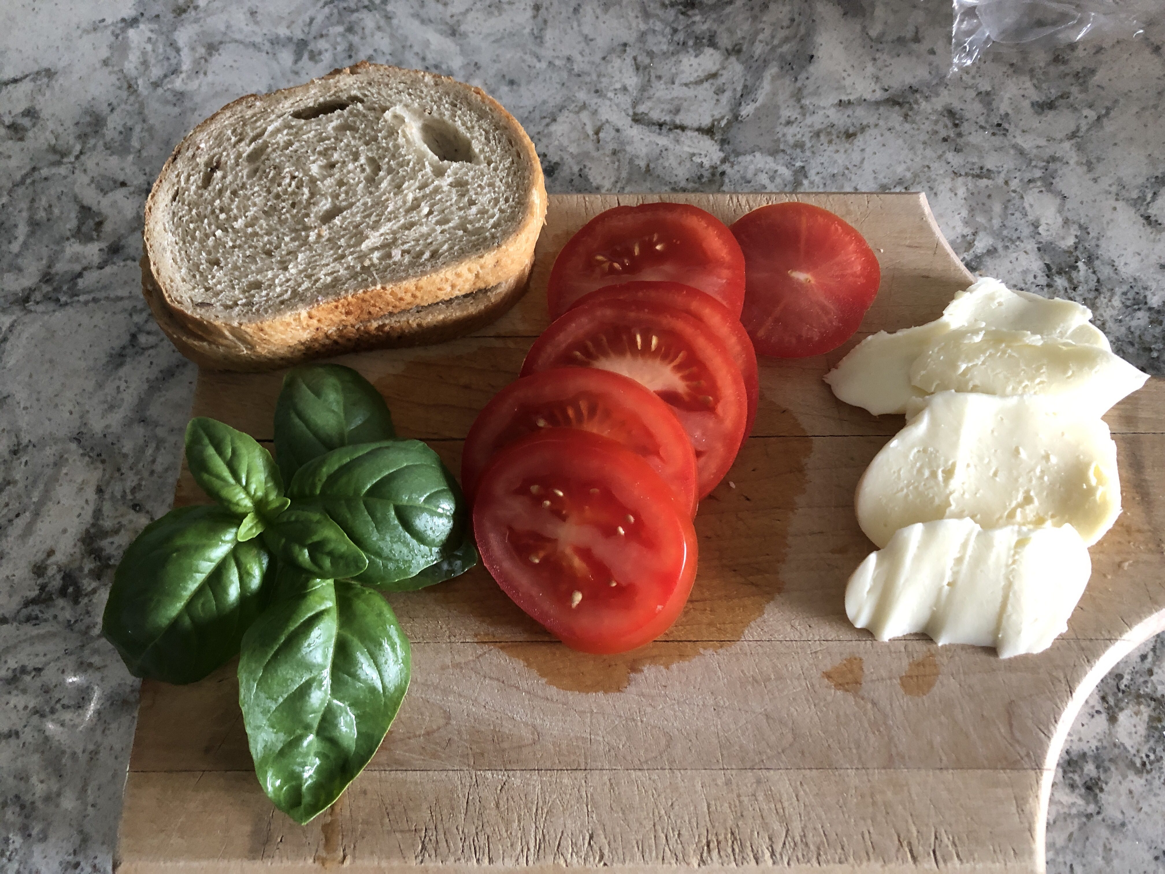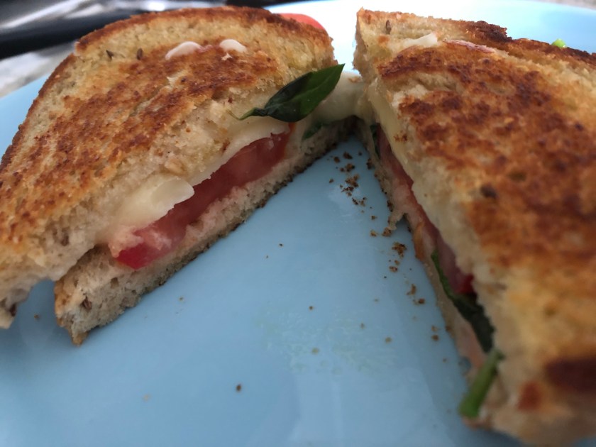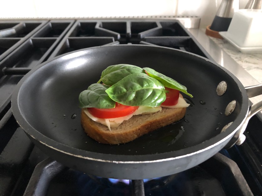 This is a quick and tasty addition to any summer lunch. Fresh basil with tomato and mozzarella, grilled until fragment and melty, has been my go-to sandwich for the last couple weeks. My basil plant is bushing out nicely, and I love the smell of basil leaves as much as that of any flower! Summer in a sandwich!