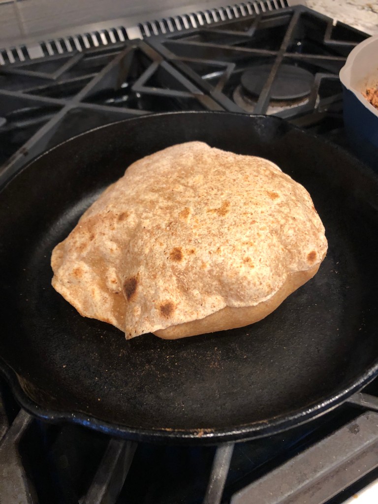 - Place a tortilla on the pan until it puffs up and gets brown underneath (less than a minute), flip and cook a further few seconds