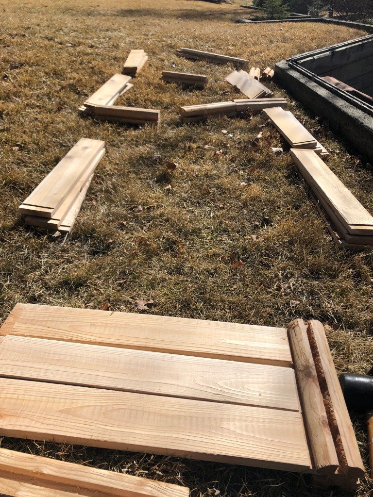 This is our first spring in this house. The potting shed has good windows and shelving for protecting young plants, but it had no place to store tools. It did however have some wooden paneling from the 70s, a pegboard and some 2x4s in the rafters, so we used those to cover the back wall of the shed, covering the long protruding nails, and creating some tool storage.