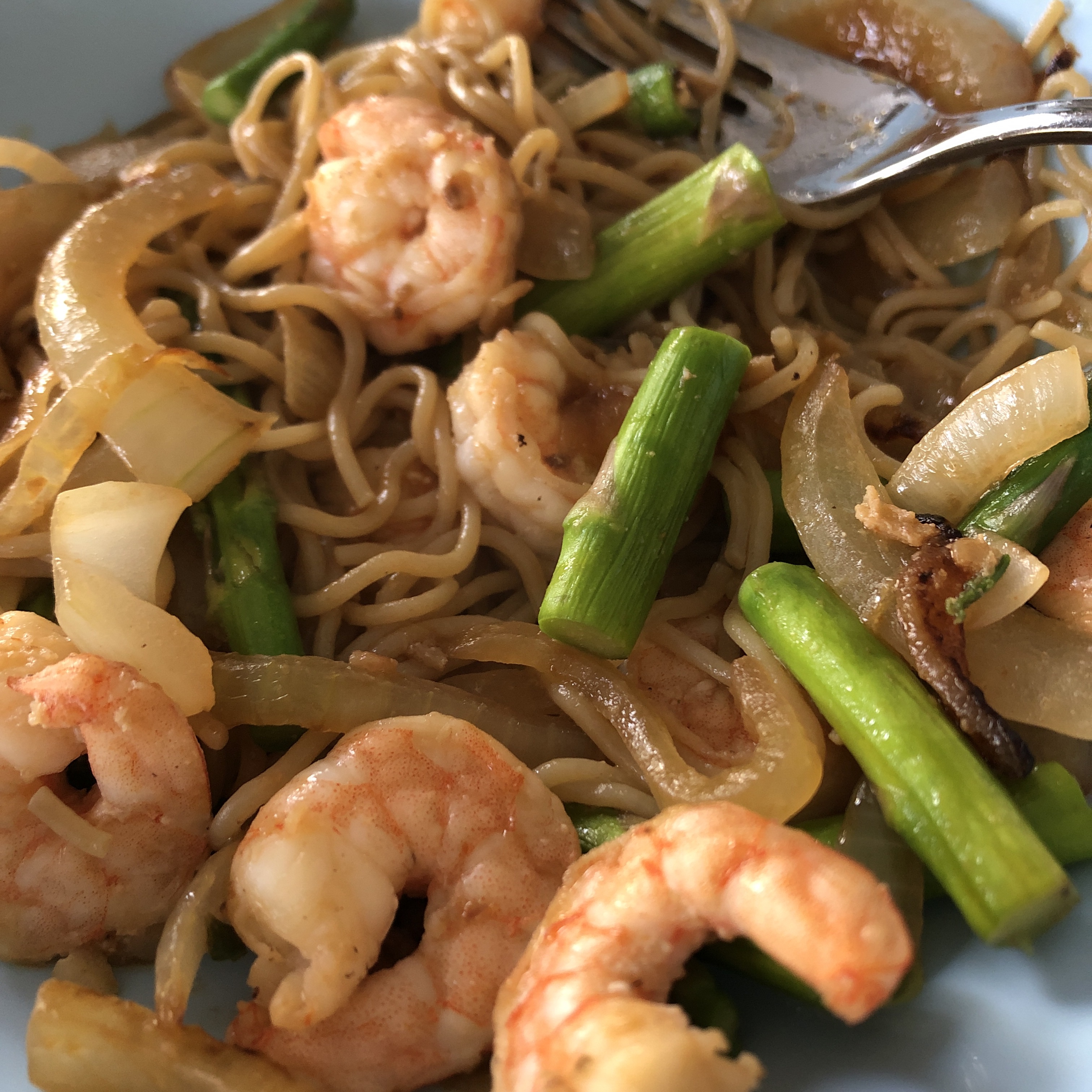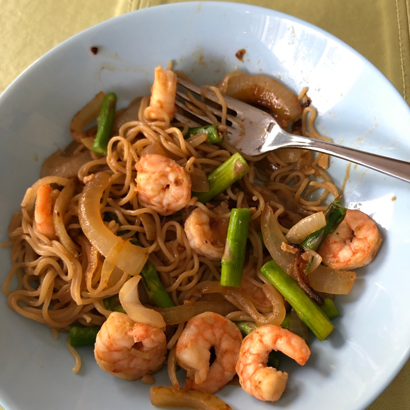 Boil water for the ramen, and prepare according to package directions. Cut the asparagus into two-inch pieces and lightly steam in the microwave. Saute the sliced onion in a tablespoon of olive oil. When soft, add the ginger, garlic, and sriracha. Add the shrimp and cook until pink. Add the soy sauce, drained noodles and asparagus to the shrimp and toss until all the ramen is coated with the sauce. Delish!