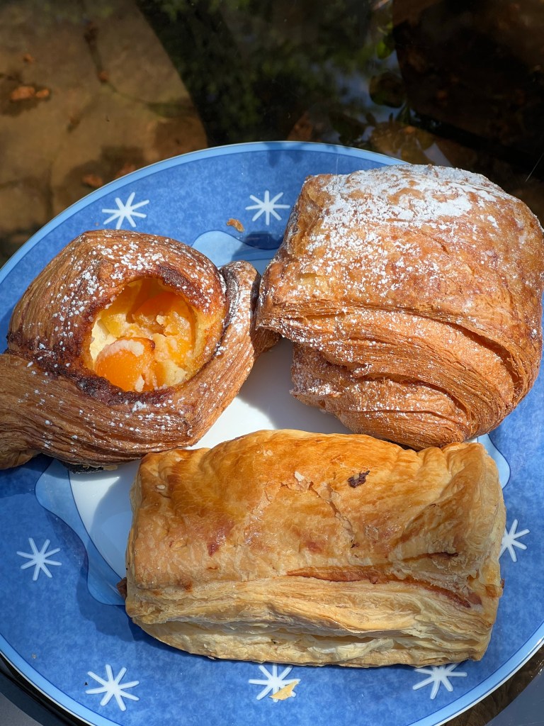 I have to mention that their pain au chocolate is very good. Lots of dark chocolate in the center. No searching required. The height of the pastry and lamination are the best we have seen yet. The apricot-almond pastry was also excellent. My husband tried a chicken pastry (think chicken sausage roll) which he liked a lot. La Boulangerie serves breakfast and lunches on their beautiful outdoor patio as well.