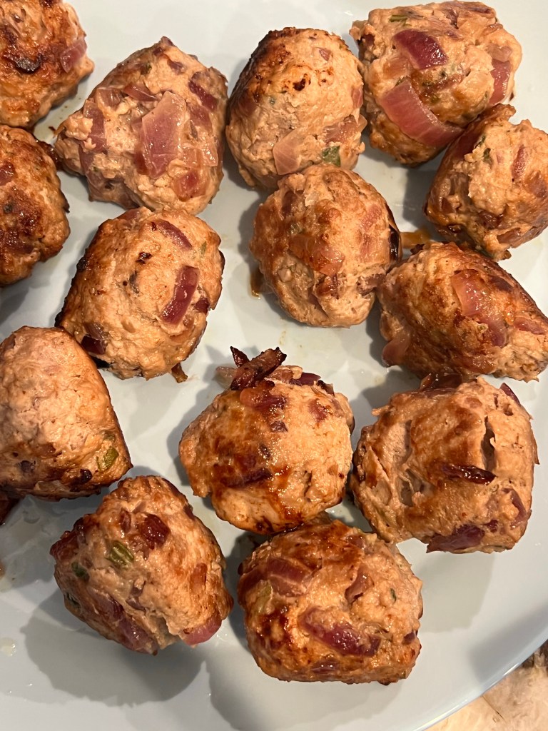 We enjoy these turkey herb meatballs as an addition to a pasta with tomato sauce, or on their own as the meat portion of a meal. The fresh herbs impart much more flavour than using dried. We don’t add any filler or binders, so don’t overcook them or they will dry out. I used a red onion in the photos as it is what I had. Regular yellow onions will work just as well.