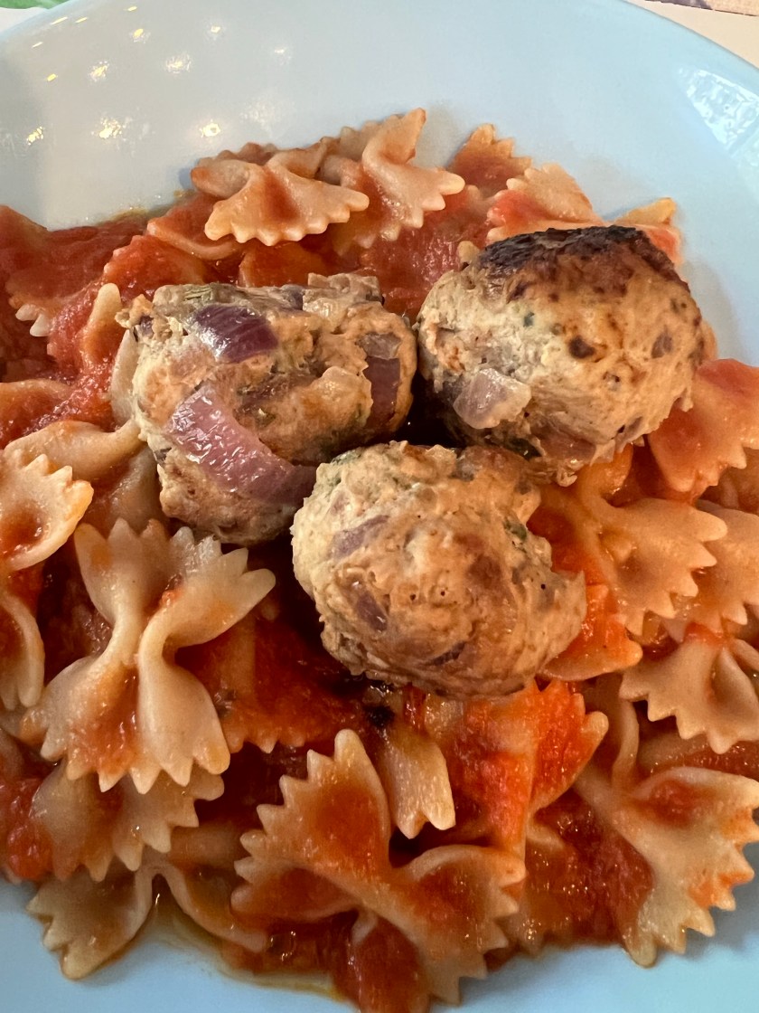 We enjoy these turkey herb meatballs as an addition to a pasta with tomato sauce, or on their own as the meat portion of a meal. The fresh herbs impart much more flavour than using dried. We don’t add any filler or binders, so don’t overcook them or they will dry out. I used a red onion in the photos as it is what I had. Regular yellow onions will work just as well.