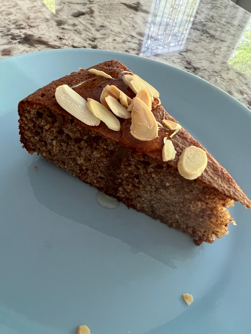 One of my sisters-in-law asked me if I had a cake recipe that used almond flour – this one is for you Roo! We like this cake as it is reminiscent of the flavour of marzipan without the intense sweetness. I like to serve it drizzled with a bit of honey and sprinkled with sliced almonds. You could also serve it with fruit or whipped cream.