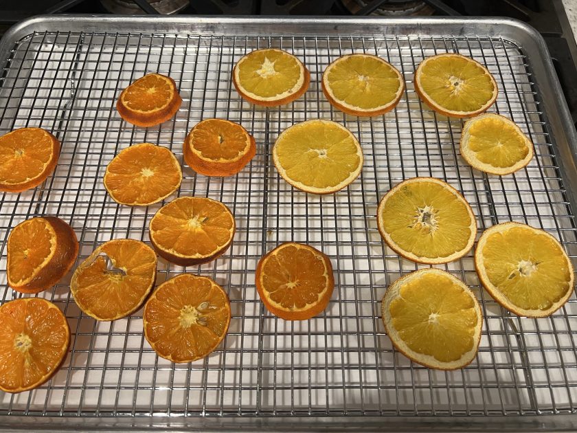 I like to cover a sheet pan in parchment and then place a cooling rack on top of the paper. Cut the oranges into 5-7 mm slices and pat with paper towel to remove as much juice as you can before laying the orange slices on the rack, leaving room around each one for good air circulation.