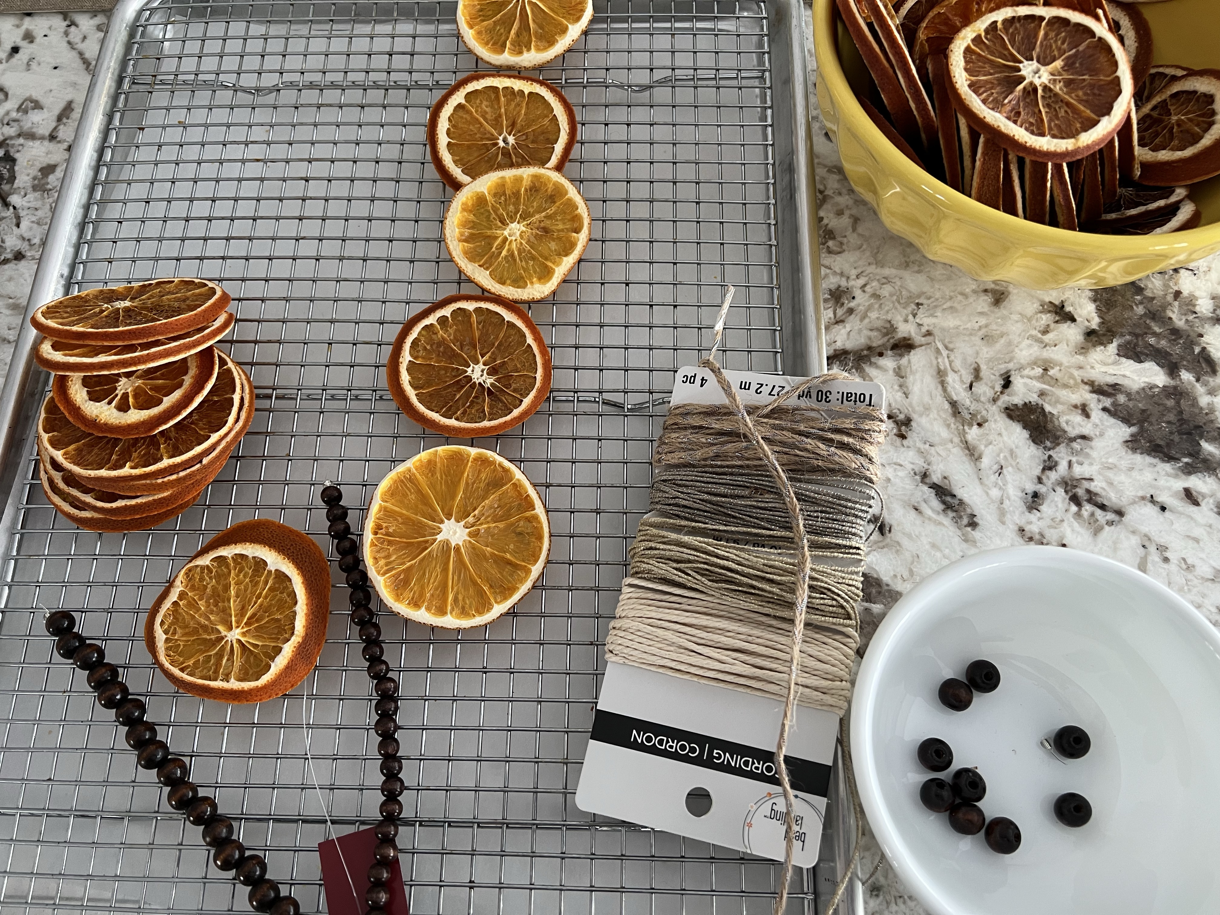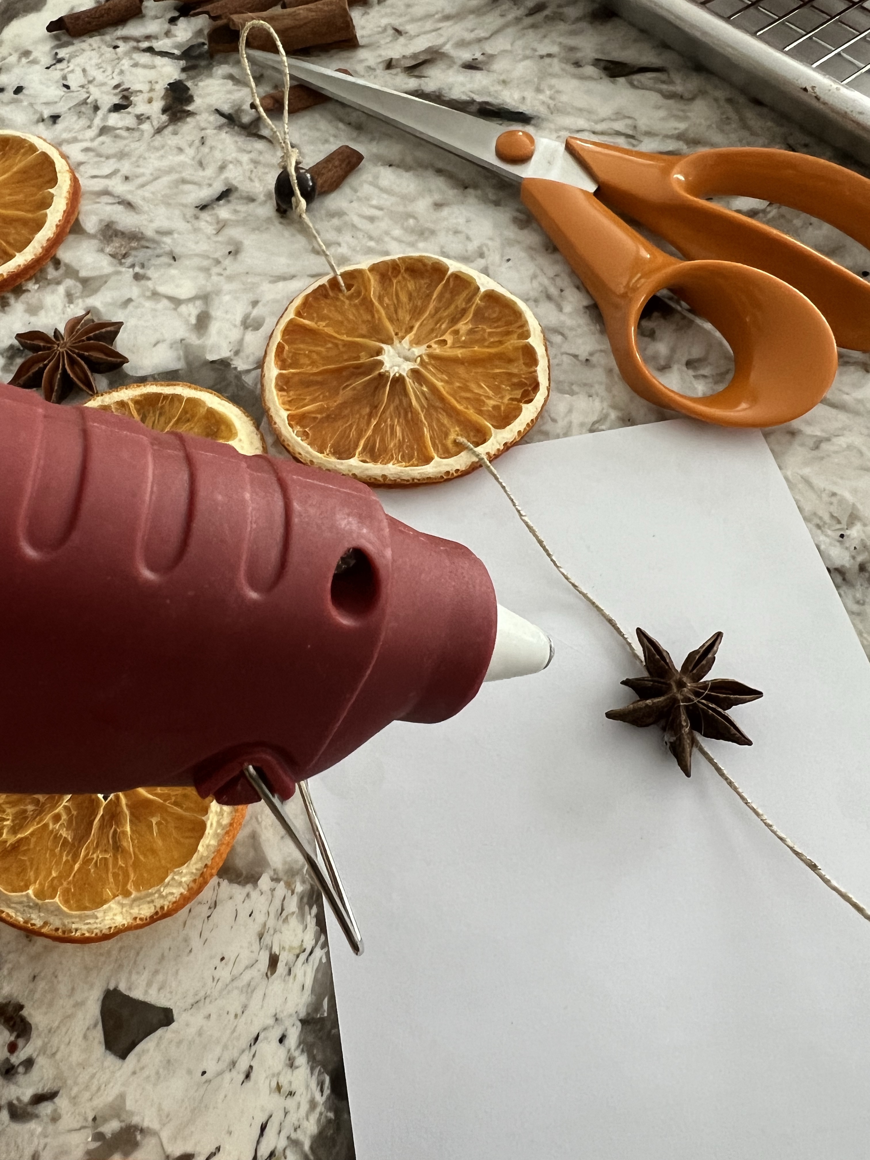 Further down the jute, I used the hot glue gun to attach star anise or cinnamon sticks to the hanging, alternating with orange slices. I finished the length with another bead, knotted in.