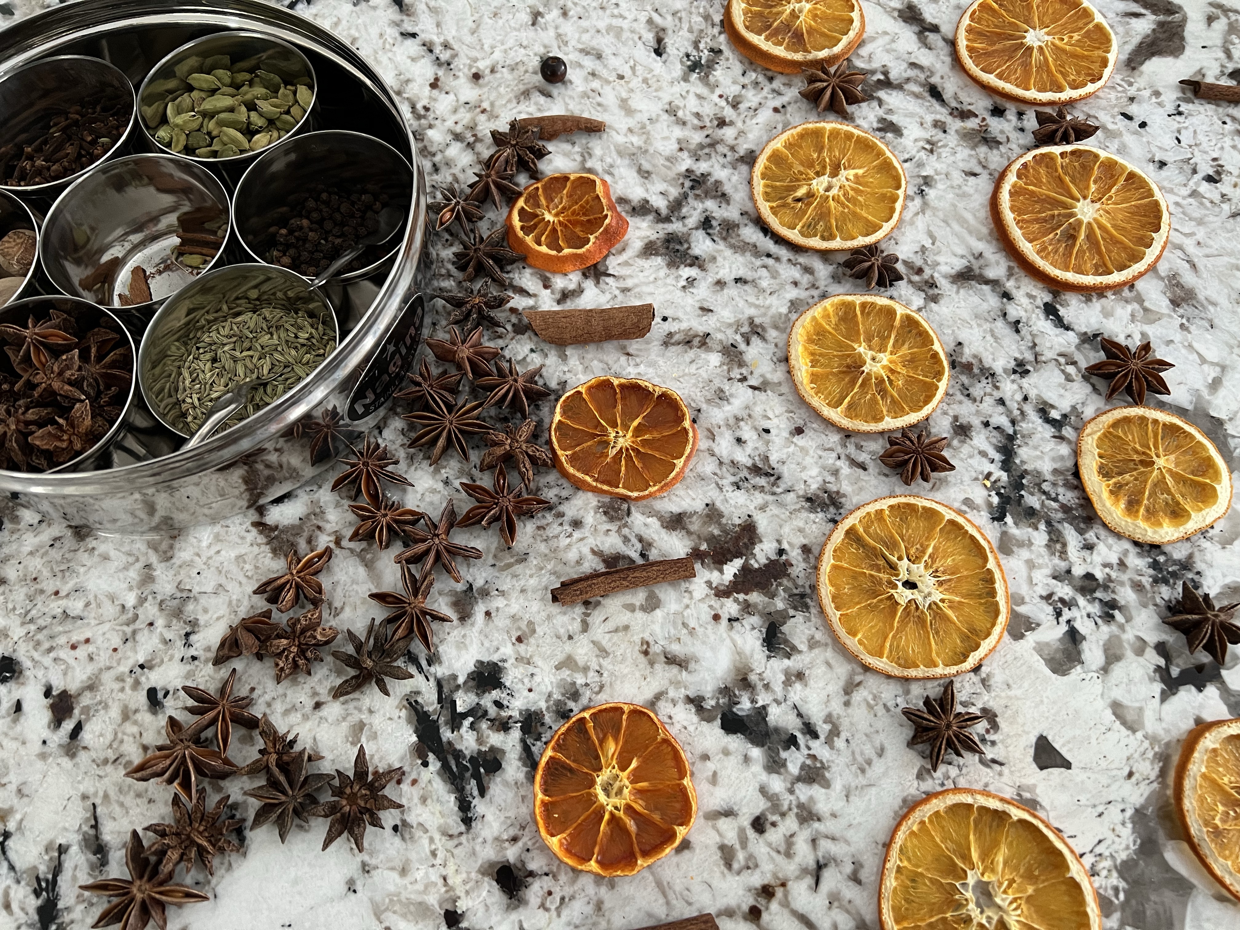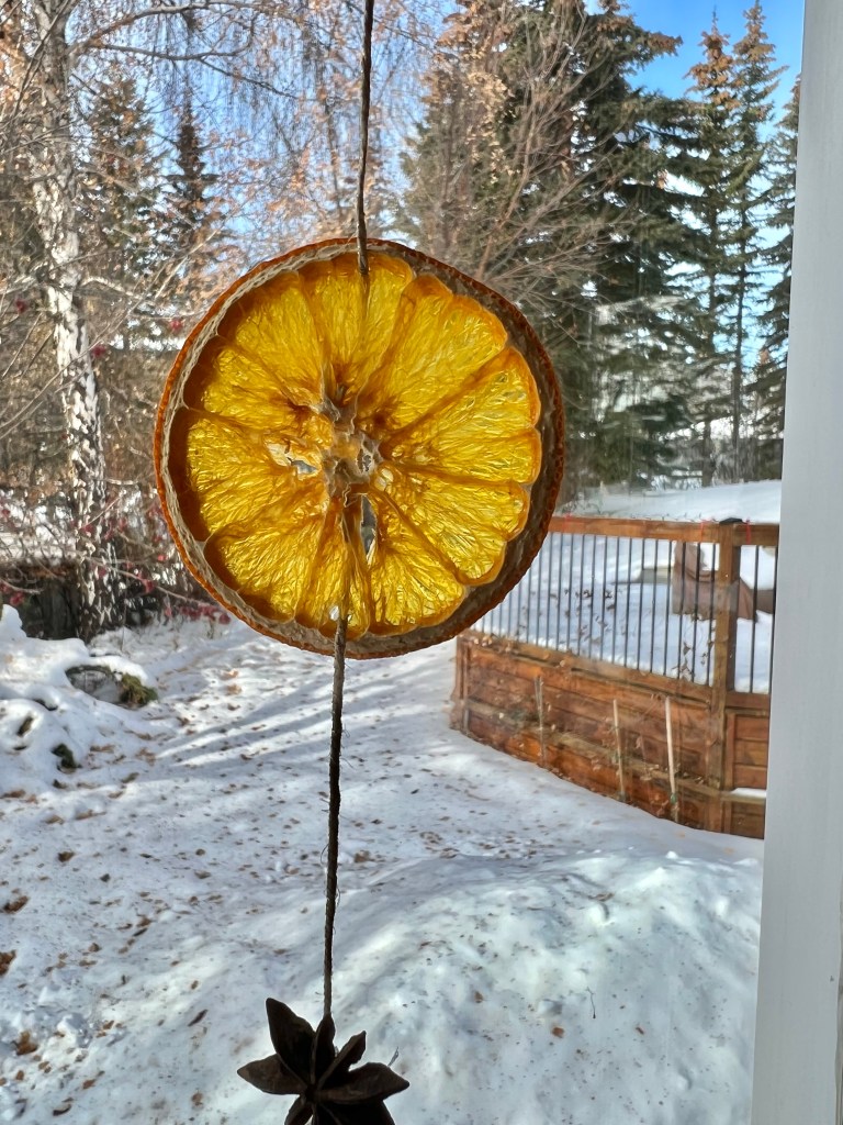 The dried oranges will last from year to year once dried, but making them is such fun that I made some more this year to suspend from jute with star anise and cinnamon sticks for accent shapes. When the sun shines through them, they light up like stained glass. I love them!