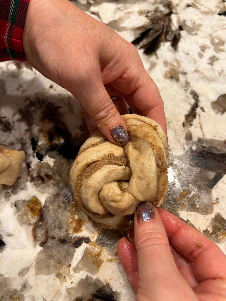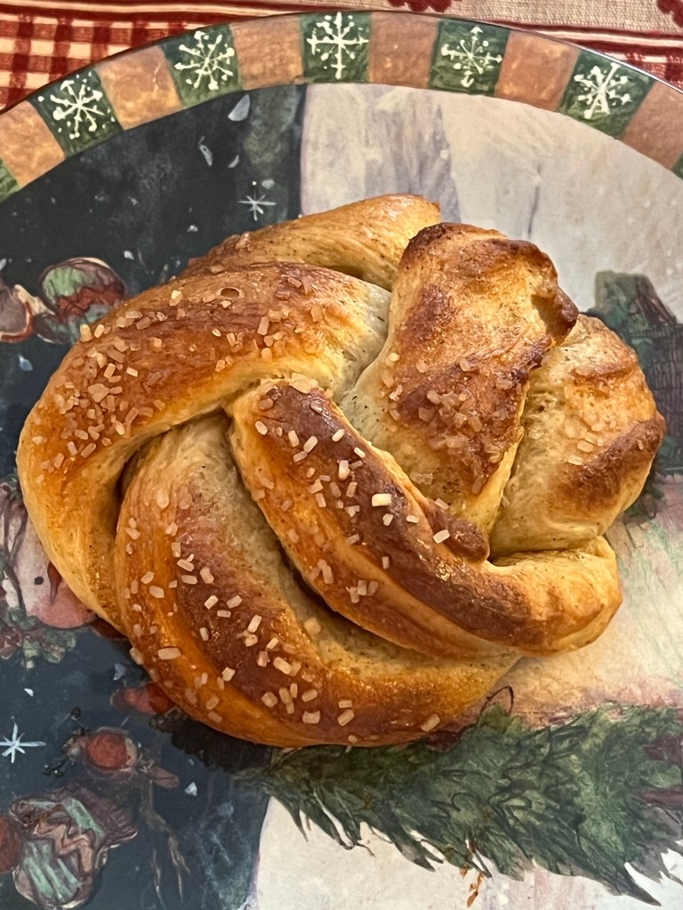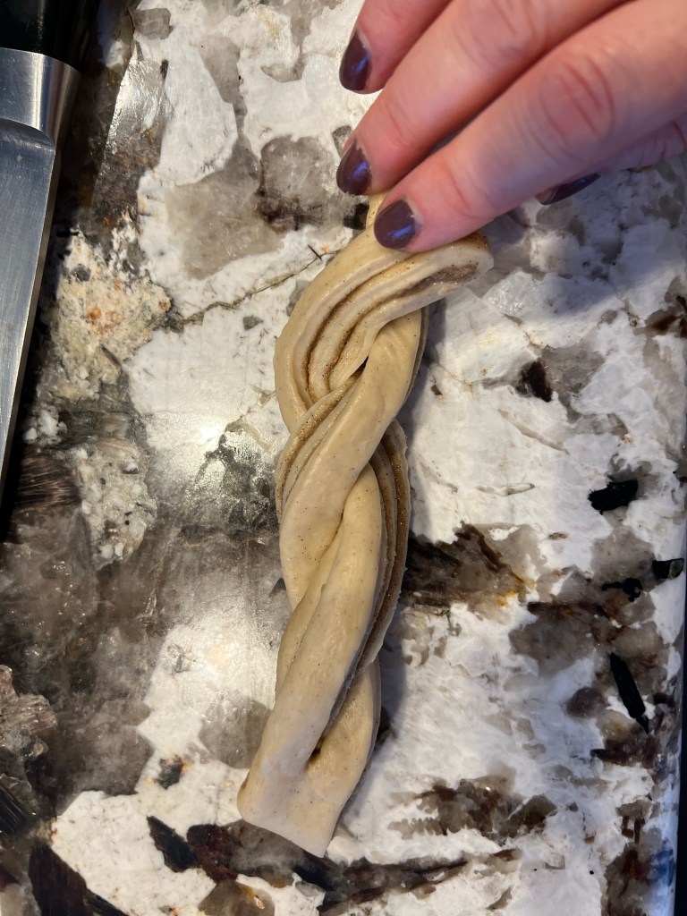 Our house is quite cool in winter, so I use my bread machine to make the dough. Add ingredients in this order: milk, butter, salt, sugar, flour, cardamom and yeast. Complete dough cycle.