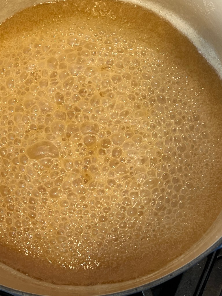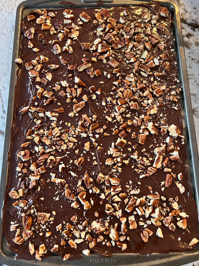 Butter a cookie sheet, cover with half of the nuts and set aside. In a heavy 3 quart saucepan, combine butter, water, sugar and syrup. Place on high heat and stir with a wooden spoon until mixture is combined and mixture comes to a boil. Reduce heat to low and do not stir further. Cook syrup to 290F (145 C) or soft crack stage (snaps in water). It will become brown instead of amber. Don’t be tempted to remove it from the heat early, or the toffee will not “snap”. Remove from heat and pour over nuts, spreading evenly. Cool. Spread with melted chocolate – press nuts into top. Cool and break into pieces.