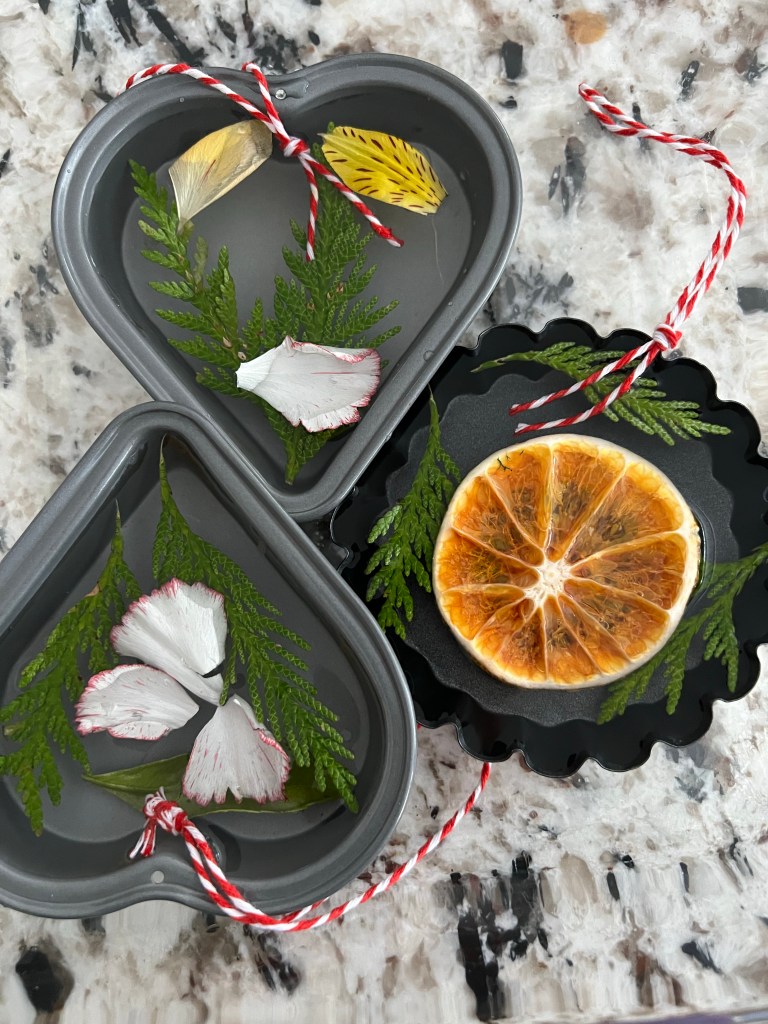 The trees felt a little empty after I took down my Christmas snowflakes, so I made these ice hangings out of the remnants of my Christmas arrangements. I put a few bits of plant material in individual mini cake containers, added a string and filled them with water. After a few hours in the freezer and a dip in hot water to loosen them, I hung them outside. It was a satisfying little project and would be a bit of winter fun for kids too.