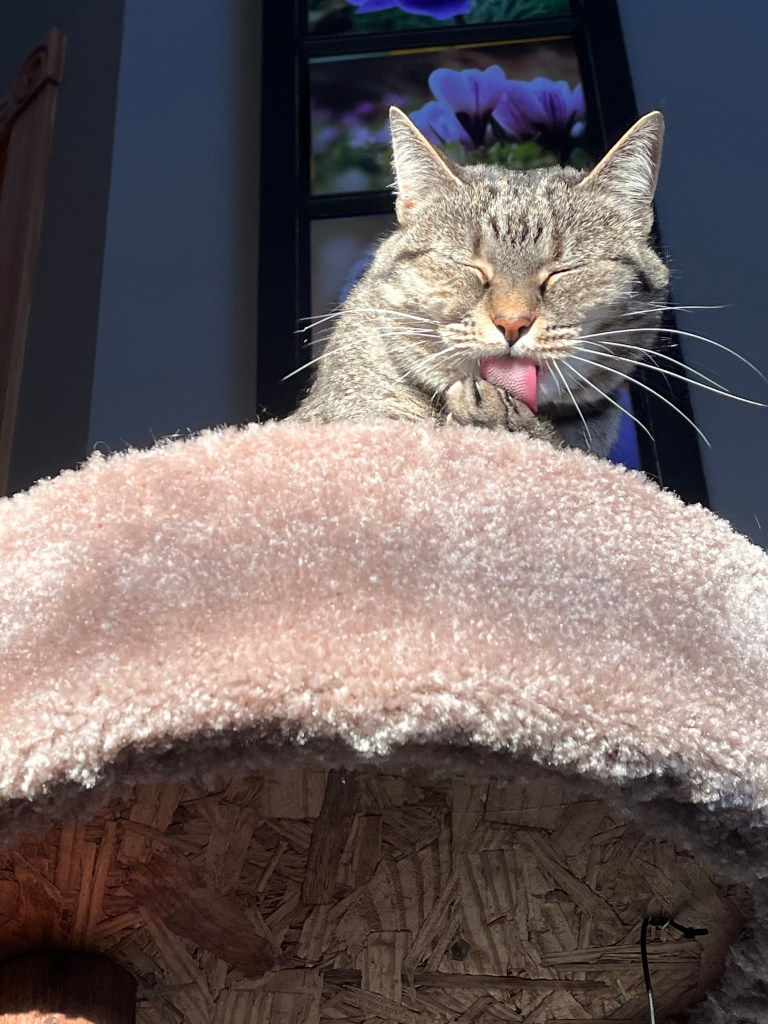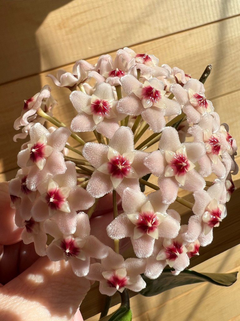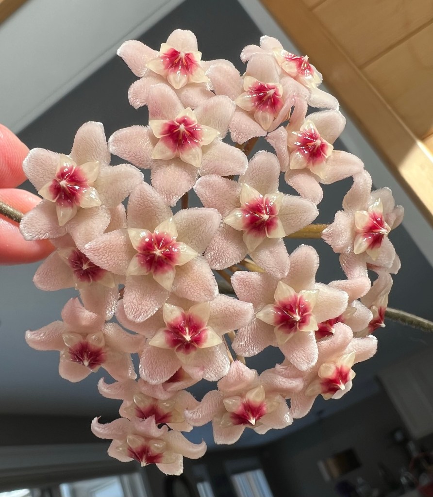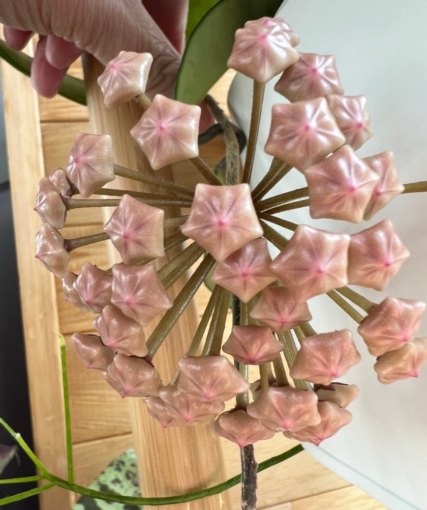 Hoyas produce such unusual flowers – waxy on parts, looking like cat tongues on parts and producing sweet nectar. It is always a treat when they come into bloom. They like filtered light and are easy to grow.