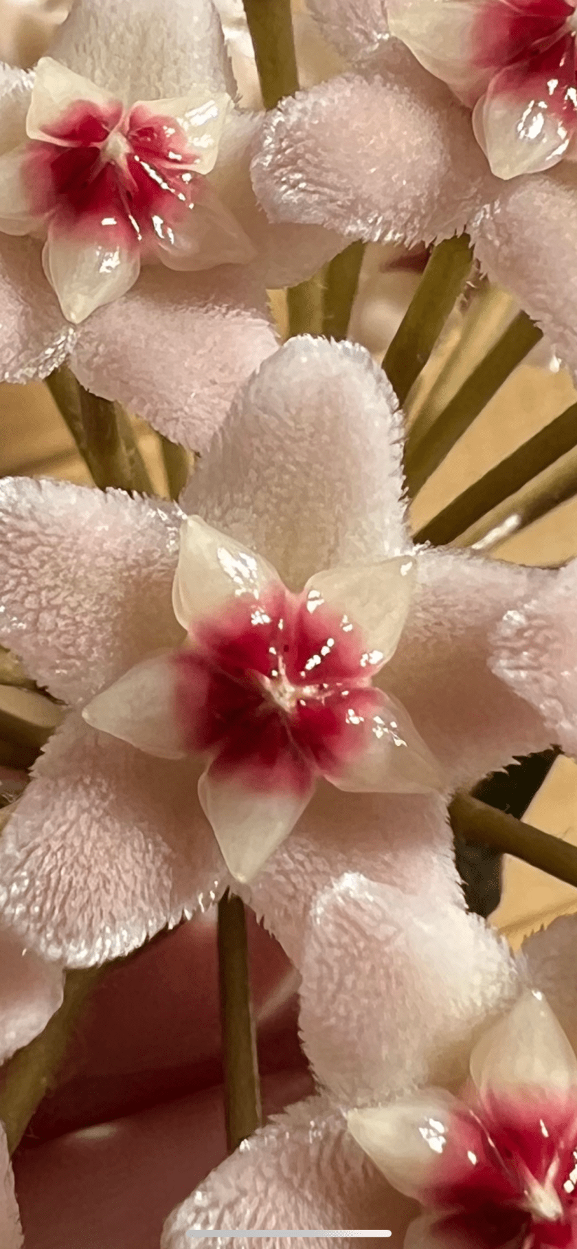 Hoyas produce such unusual flowers – waxy on parts, looking like cat tongues on parts and producing sweet nectar. It is always a treat when they come into bloom. They like filtered light and are easy to grow.
