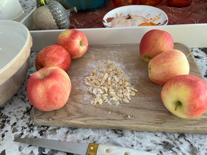*Separately, sprinkle flour over the crystallized ginger and chop it finely. The flour helps keep the cut pieces from sticking together. (You don’t want someone getting a bunch of them in one mouthful, so we will evenly sprinkle them on the pastry before adding the apples.)