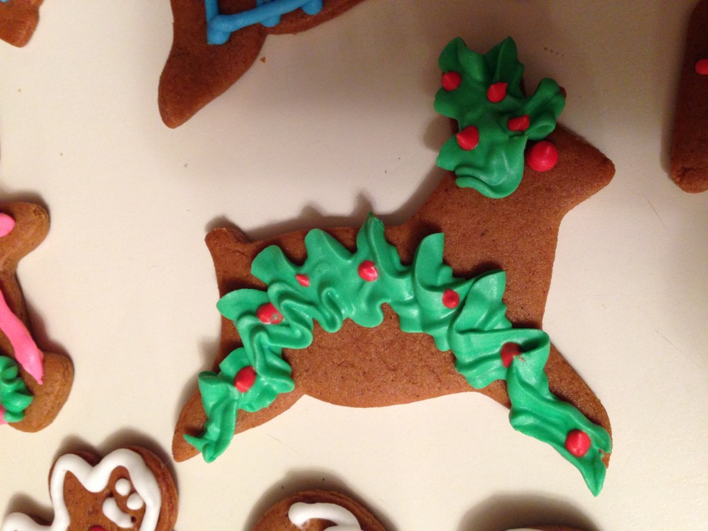 The original decoration was half a blanched almond stuck into a gingerbread circle. This is the way my dad preferred them as they were traditional to his family as well. When my kids were young, we cut them into all manner of Christmas shapes and decorated them with coloured royal icing. The last several years I have been using cookie cutters that imprint details into the cookie, thus saving the need to decorate them, as I like the taste of the cookie without the icing. They are small, which allows us to have one of these and perhaps one of some other type as well with our tea or coffee.