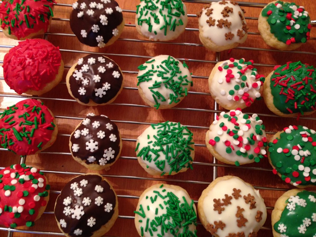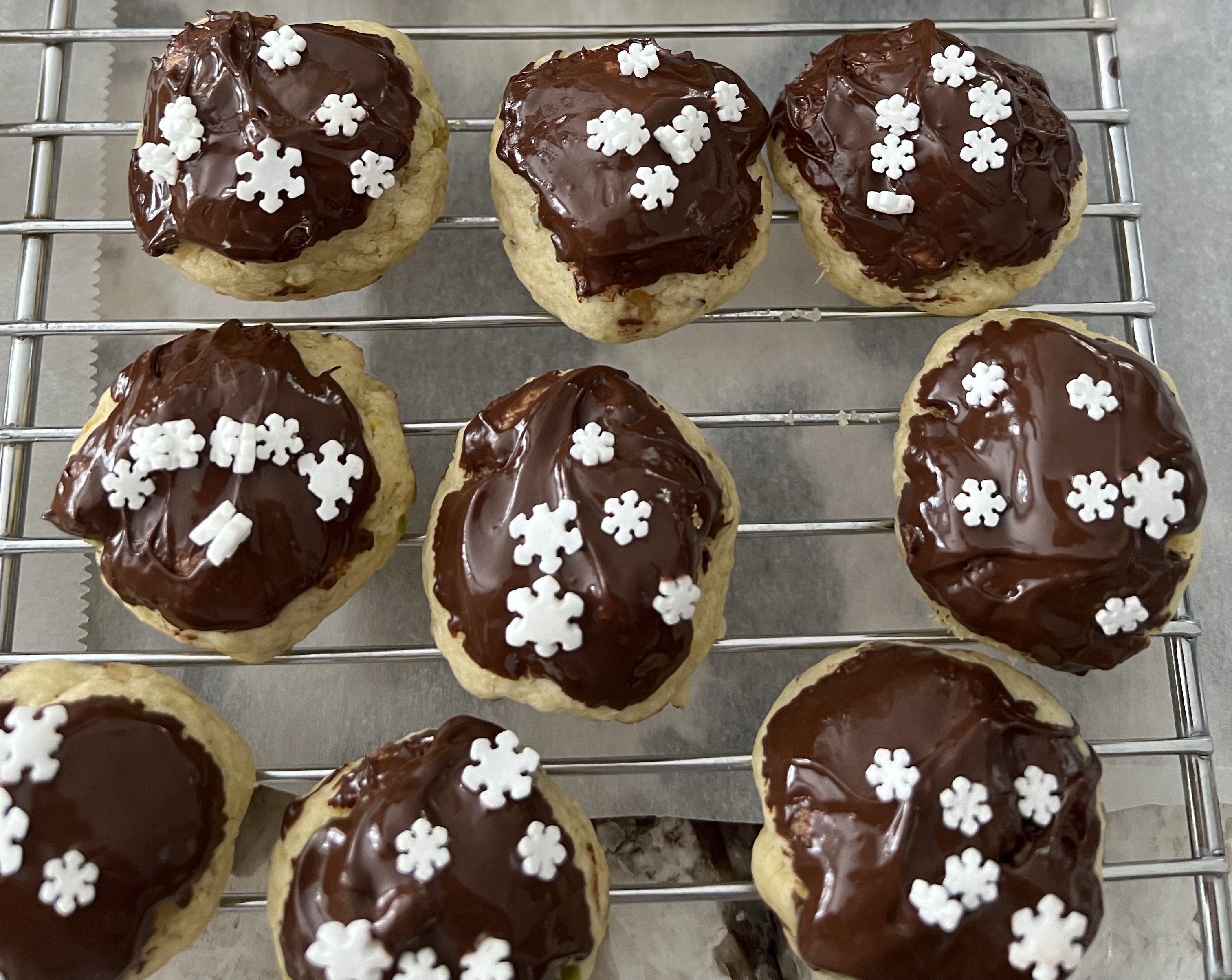 These are a simple alternative to the rolled and cut sugar cookies. They still look festive, but decorating them is a snap. You can use coloured melting-type chocolate, white, dark or milk chocolate, and whatever type of sprinkle topping you prefer. I added pistachios, ginger and lemon this year to add more Christmas flavour.