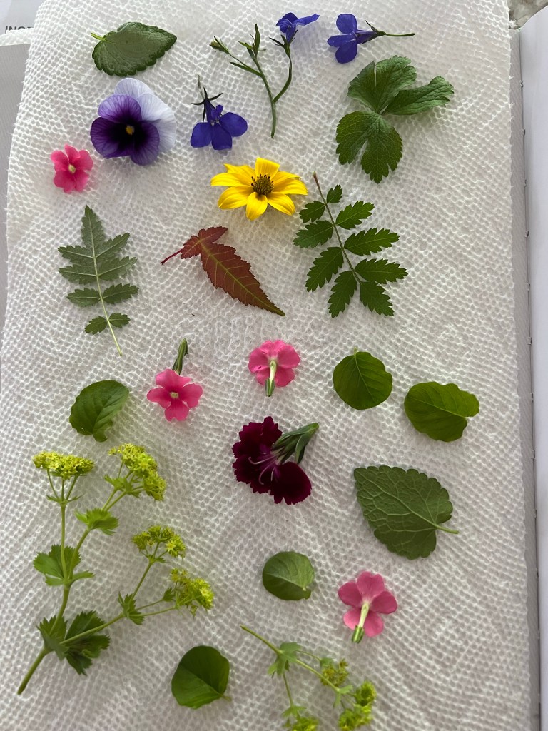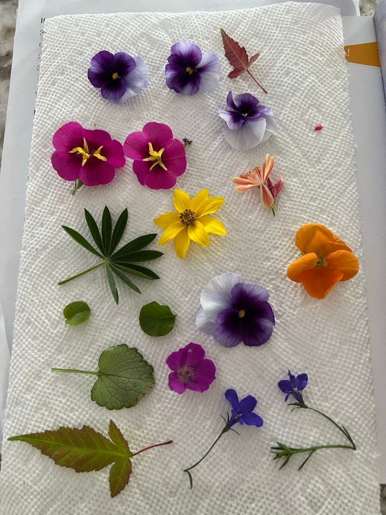 Last fall I decided to do a small batch of dried, pressed flowers and leaves to use in a craft of some sort to extend my enjoyment of the blooms. I used paper towels to line the pages of a book to press them, but if you do not like the texture they add to the petals, you could simply use tissue paper. Had I known they would end up being coasters, I would have trimmed a bit more off the back sides of the flowers to make them flatter, but I still had enough flat ones to work with.