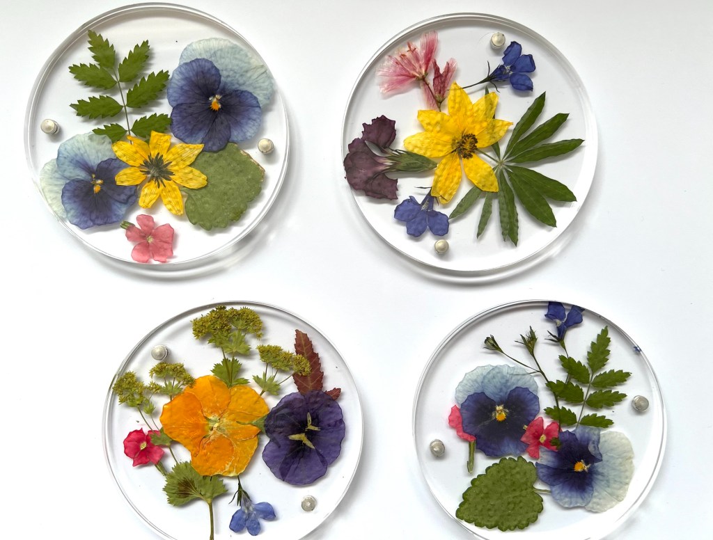 I bought coasters made of plexiglass held together by two sets of magnets and simply arranged the dried blooms inside. I think these will be fun to refresh with fall leaves and flowers at some point as well, as they are easy to pull apart and change the botanicals. The first flowers I tried were too thick, so the top tilted when setting a cup on the coaster. Coasters with 4 magnet sets they would be more balanced, otherwise very thin flowers are required. Very quick and easy project that adds some flowers to the long winter.