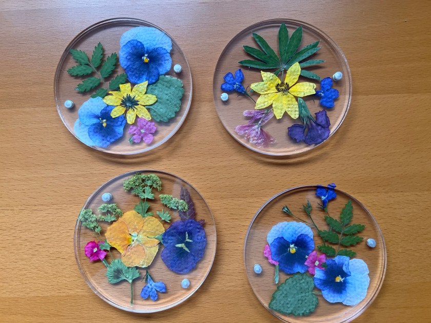 I bought coasters made of plexiglass held together by two sets of magnets and simply arranged the dried blooms inside. I think these will be fun to refresh with fall leaves and flowers at some point as well, as they are easy to pull apart and change the botanicals. The first flowers I tried were too thick, so the top tilted when setting a cup on the coaster. Coasters with 4 magnet sets they would be more balanced, otherwise very thin flowers are required. Very quick and easy project that adds some flowers to the long winter.