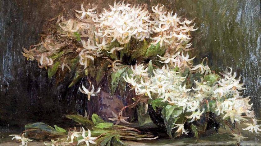 The painting Wild Lilies is very different subject matter from Emily Carr’s more well known works. I first saw it after reading her description of them in The Book of Small. I loved her description of the scent of the lilies around her home – their perfume like heaven and earth mixed – which I think is apt for many garden leaves and flowers.