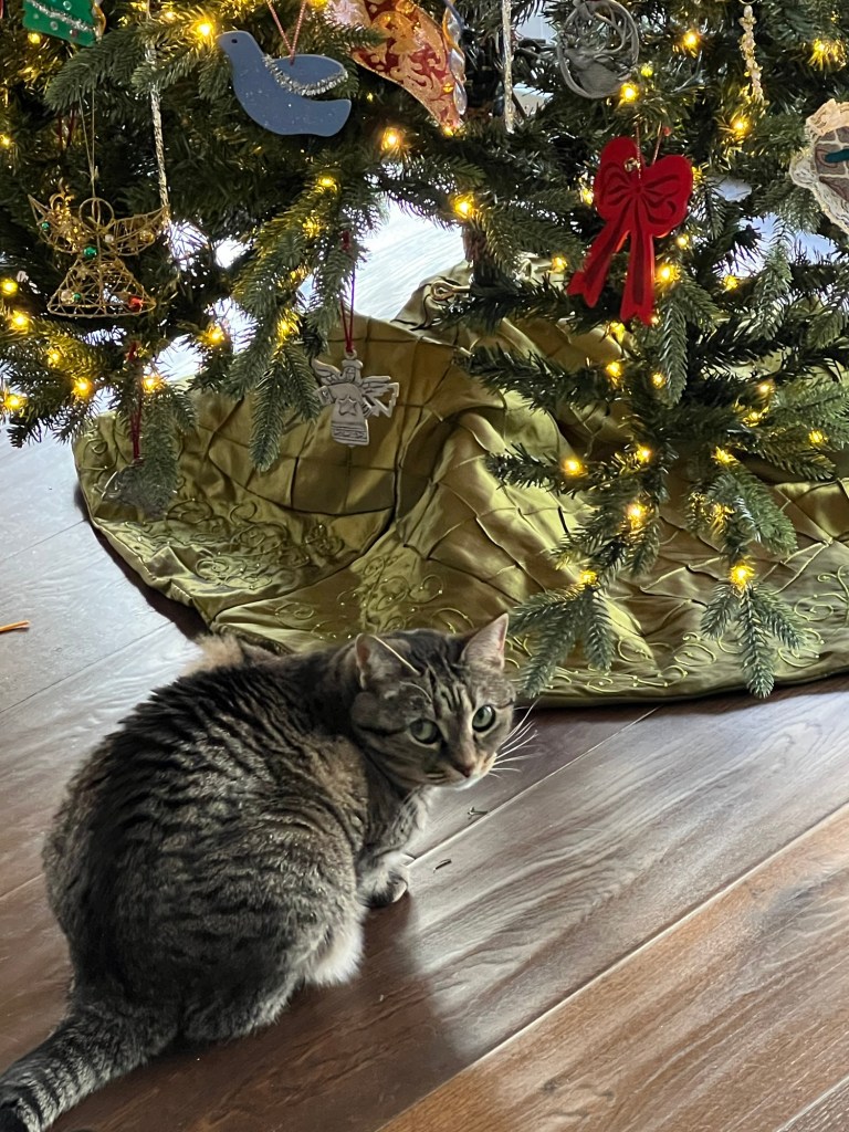 Cats trying to look innocent as they size up the hanging toys on the tree…. Perhaps more fun for the cat than me 😉