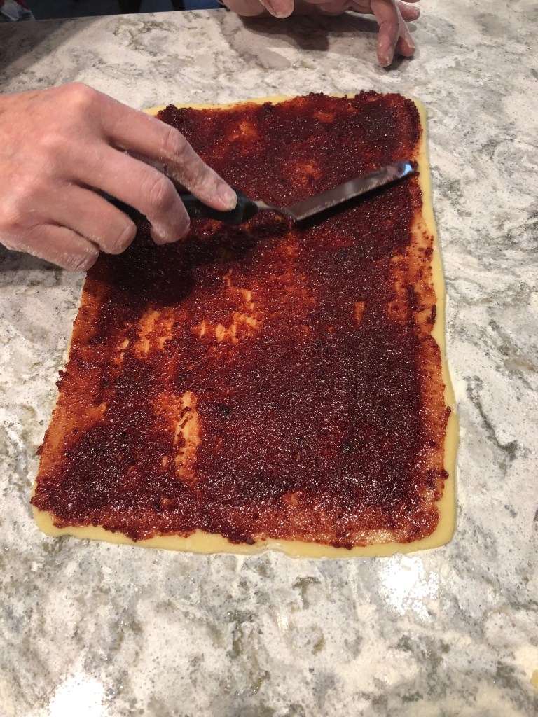 - Divide dough in half. On a lightly floured surface, roll each portion of dough into a 12×8-in. rectangle. Spread each with half of the cranberry mixture; roll up jelly-roll style, starting with a short side.