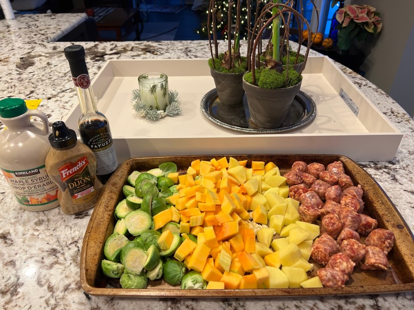 I love this chop and roast meal. The veg can be prepared ahead of time and then tossed in the dressing just before roasting. It also re-heats nicely, so you could even make it ahead.