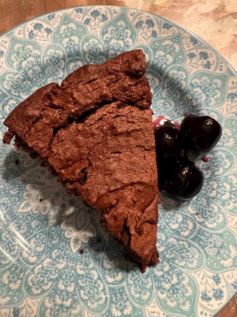 This cake has good chocolate flavour as well as a surprisingly good texture in spite of there being no flour, sugar, nuts or fats in the cake. I like to serve it with some amarena cherries or a little ice cream.